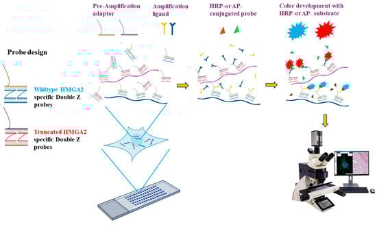 RISH was performed using the ACD RNAscope 2.5 Duplex Detection kit (Bio-Techne, Minneapolis, MN, USA) according to the manufacturer’s instructions. An outline of the assay is shown in Figure 6, where formalin-fixed, paraffin-embedded (FFPE) tissue sections underwent a series of preparatory steps, including deparaffinization, permeabilization, antigen retrieval, and protein removal, before hybridization with the designed probes. Following multiple amplification steps, probes conjugated with horseradish peroxidase (HRP) or alkaline phosphatase (AP) enable signal detection. Color development was achieved by applying specific substrates for HRP or AP, allowing visualization of the target isoforms (Figure 6). More specifically, tissue microarray and FFPE slides were baked at 60 °C for 30 min. Slides were deparaffinized with xylene, followed by ethanol. After treatment with hydrogen peroxide for 10 min, slides were boiled in target retrieval solution for 15 min and then treated with protease for 30 min. Following brief washes, slides were incubated with probes specific to wild-type HMGA2 and truncated HMGA2 for 2 h at 40 °C. Slides then underwent a series of amplification steps, followed by color development. Slides were subsequently imaged using the Aperio Scanner, Leica Biosystems, Inc., Deer Park, IL, USA.