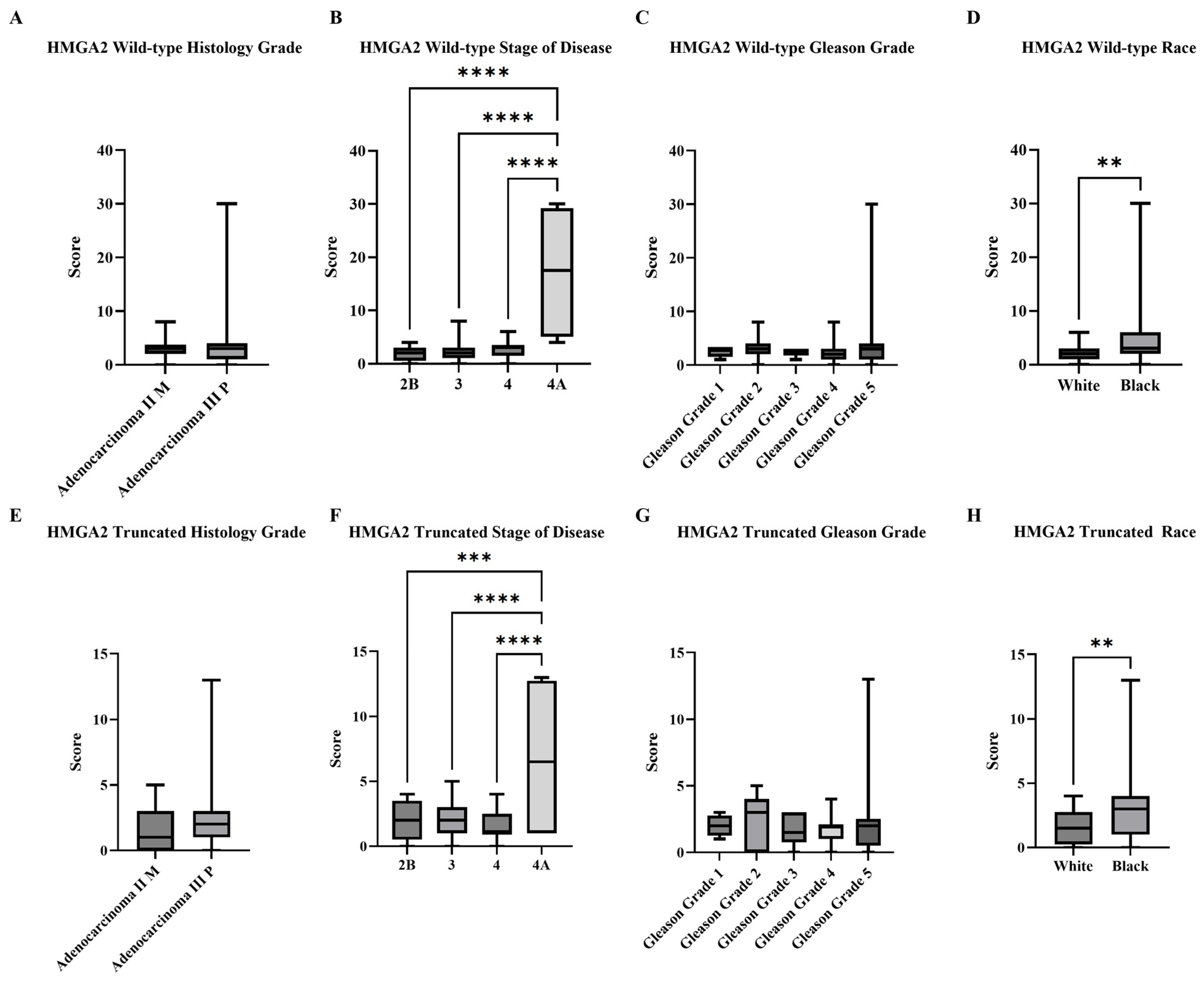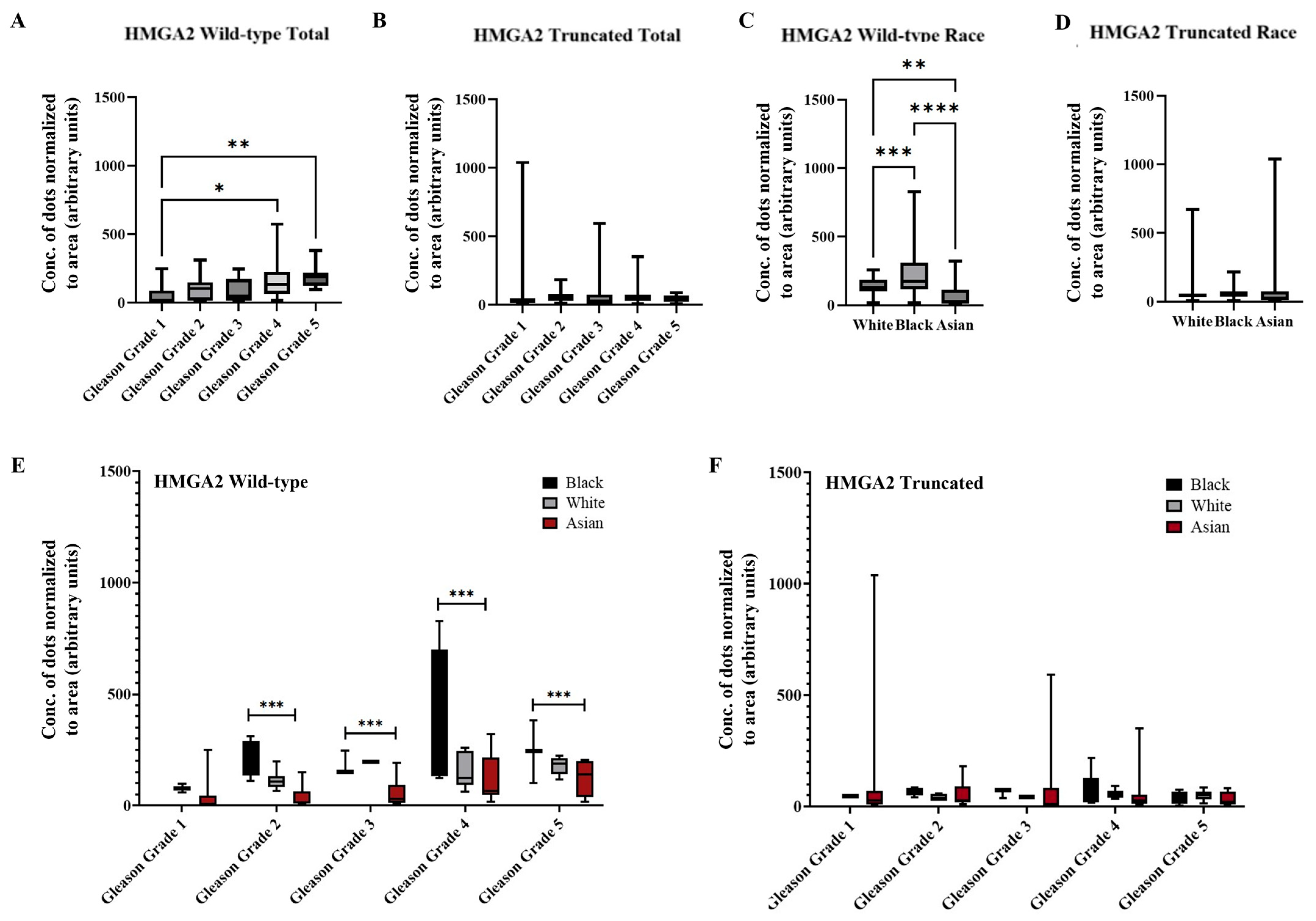 Based on the data from all three sample sources, analyses focused on Gleason grade and race. As shown in Figure 5A, wild-type HMGA2 expression increased with Gleason grade, with significantly higher expression in grades 4 and 5 compared to grade 1. In contrast, truncated HMGA2 showed no statistically significant differences across Gleason grades (Figure 5B). Additionally, wild-type HMGA2 expression varied significantly by ethnicity, with the highest expression observed in Black patients and the lowest in Asian patients (Figure 5C). No significant differences by race were detected for the truncated isoform (Figure 5D). Figure 5E presents a combined analysis of Gleason grade and race for wild-type HMGA2, revealing a marked difference between Black and Asian patients in samples with Gleason grade > 2. Consistently, the truncated HMGA2 showed no statistically significant differences in this combined analysis (Figure 5F).