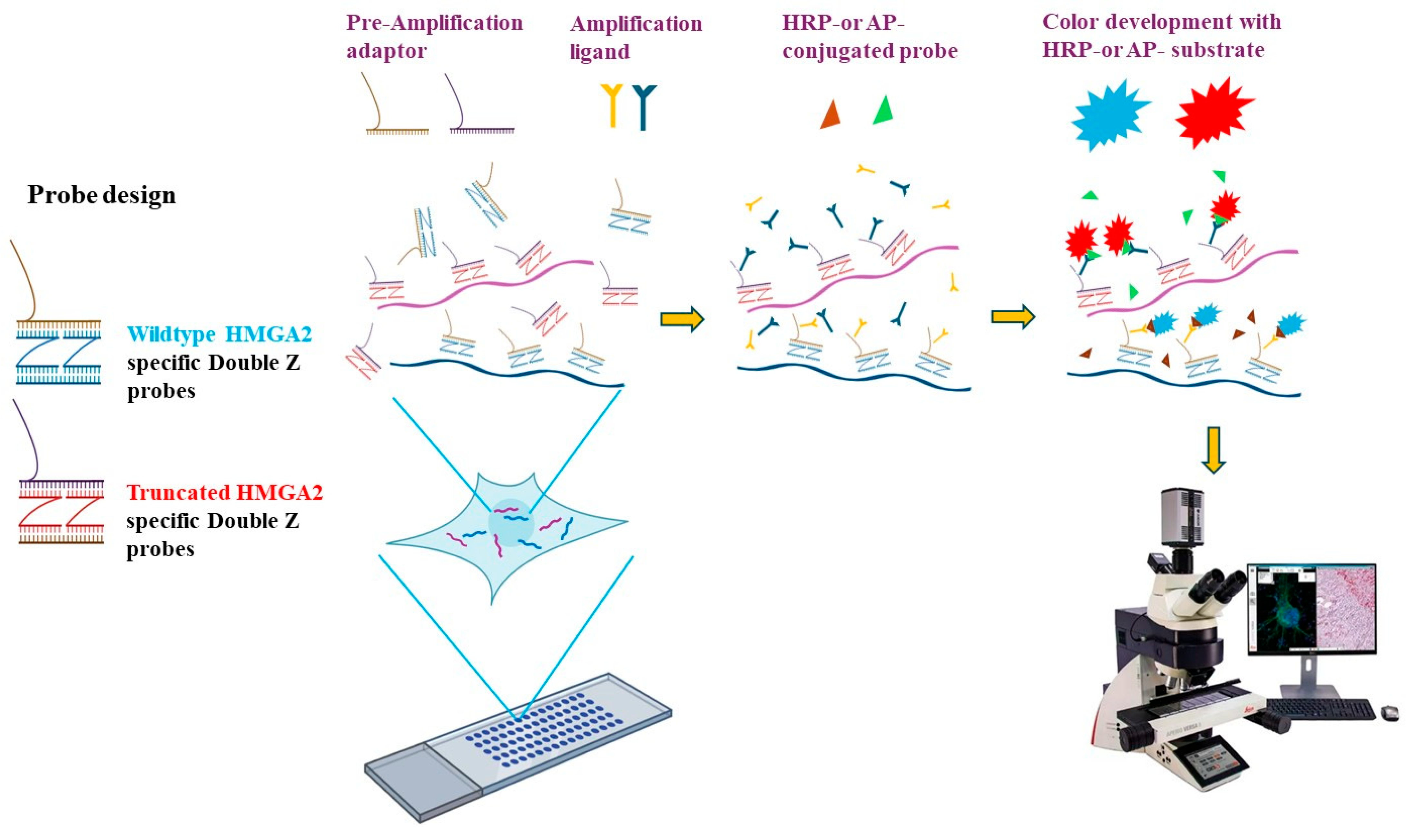 Unlike Northern blotting and quantitative PCR, RNA RISH enables visualization and localization of target mRNA transcripts within cells and tissue samples. In cases where specific antibodies are unavailable to distinguish between isoforms of the same gene, RISH provides a powerful approach for studying isoform expression of disease-related genes in tissue sections. The wild-type HMGA2 isoform includes exon 5 and a long 3′ untranslated region (L-3′UTR), whereas the truncated isoform replaces this region with exon 4 and a short 3′UTR (S-3′UTR). To detect these isoforms, specific probes were designed to target exon 5 for the wild-type isoform and exon 4 for the truncated isoform of HMGA2. The probes consist of short primers in a double Z configuration paired with pre-amplification adaptors, forming the specific RISH probes (Figure 6).