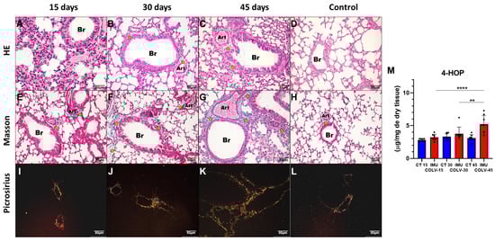 Histological and Collagen Deposition Patterns in Lung Tissue Following COLV Immunization. Representative images of lung sections stained with Hematoxylin & Eosin (H&E), Masson’s Trichrome, and Picrosirius Red at 15, 30, and 45 days after COLV immunization (IMU-COLV), compared with non-immunized controls (CT). H&E staining (A–D) illustrates inflammatory changes (blue arrows) and airway-associated remodeling. Masson’s Trichrome (E–H) highlights collagen deposition (yellow asterisks) and structural alterations in peribronchial and perivascular regions. Picrosirius Red staining under polarized light (I–L) distinguishes collagen fiber maturation, showing thin (green–yellow) and thick (orange–red) birefringent fibers. Quantification of total collagen content by 4-hydroxyproline assay is shown in (M). ** p < 0.01; **** p = 0.0001. Note: Bronchiolar structures naturally vary in size across sections; this variability is acknowledged as a limitation in comparative visualization.