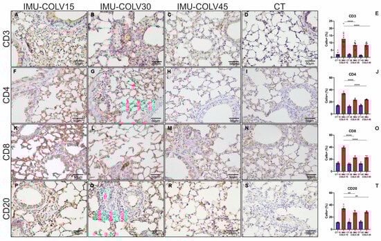 Histomorphometric analysis of lymphocytic inflammatory cell infiltration in lung tissue. Representative photomicrographs illustrate the expression of CD3, CD4, CD8, and CD20 in lung sections at 15 days post-immunization (A,F,K,P), 30 days (B,G,L,Q), and 45 days (C,H,M,R). A progressive reduction in the expression of all evaluated lymphocytic markers was observed over time, as confirmed by the corresponding quantitative analyses (E,J,O,T). The control group demonstrated minimal lymphocytic infiltration (D,I,N,S). Statistical significance: p < 0.01 (**) and p = 0.0001 (****). Note: This panel focuses specifically on T-cell and B-cell markers.