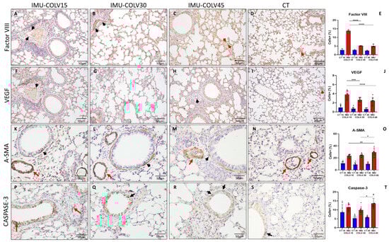 Vascular Reactivity in Lung Tissue of IMU-COLV Mice. Immunohistochemical analysis of vascular activation and remodeling in C57BL/6 mouse lungs following collagen V immunization. Factor VIII staining shows increased endothelial activation at 15 days (A), with expression declining at 30 and 45 days (B,C) to levels similar to controls (D), as quantified in (E). VEGF expression is highest at 15 days (F), localized primarily to the perivascular and peribronchial microvasculature, and progressively decreases at later timepoints (G,H), in relation to control (I), and with corresponding quantification in (J). α-SMA immunoreactivity is observed in smooth muscle layers of vessels and bronchioles across all groups (K–N), with increased thickness and intensity at 45 days (M), as shown in the quantitative analysis (O). Cleaved caspase-3 staining demonstrates a late increase in endothelial apoptosis (P–S), most prominent at 45 days, with quantification shown in (T). Red arrows denote vascular structures; black arrows indicate bronchiolar regions. Statistical significance: * p < 0.05; ** p < 0.01; *** p < 0.001; **** p = 0.0001.