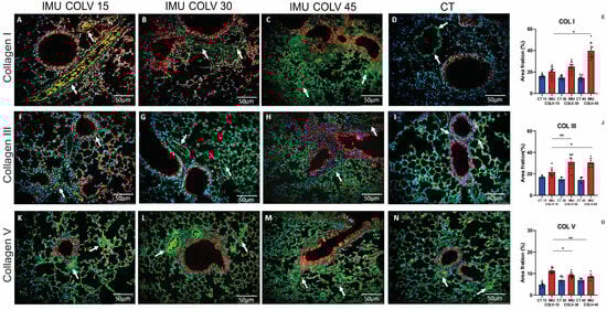Remodeling of the Pulmonary Interstitium in the IMU-COLV Model. Immunofluorescence staining of collagen types I (A–C), III (F–H), and V (K–M) in lung tissue from C57BL/6 mice 15, 30, and 45 days after immunization with collagen V (IMU-COLV), compared with non-immunized controls (CT) (D,I,N). Collagens I, III, and V are shown in green (white arrows); nuclei in blue (DAPI); red blood cells in yellow; and tissue counterstaining in red–orange. Quantitative analysis shows progressive collagen accumulation in IMU-COLV groups (E,J,O) (* p = 0.0181; ** p = 0.0031). Specificity of labeling was verified using isotype IgG controls and no-primary-antibody controls, confirming that observed signals reflect true collagen immunostaining rather than nonspecific background or autofluorescence.