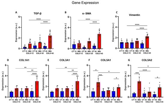 In contrast, expression of collagen V genes demonstrated a declining pattern over time, mirroring the immunohistochemical findings. Col5a1 was significantly reduced in IMU-COLV30 and IMU-COLV45 compared to IMU-COLV15 (1.29 ± 0.48 and 1.86 ± 0.30 vs. 2.78 ± 0.76; p < 0.0001 and p = 0.0093, respectively) (Figure 6E). Similarly, Col5a2 expression decreased from IMU-COLV15 to both IMU-COLV30 (1.02 ± 0.73) and IMU-COLV45 (1.81 ± 0.52), when compared to early overexpression at day 15 (2.94 ± 0.88; p < 0.0001 and p = 0.0065, respectively) (Figure 5G).