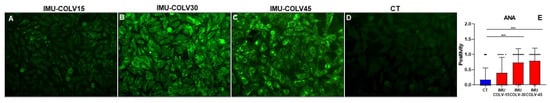 ANA Presence during Fibrosis Progression in the IMU-COLV Model. ANA research by immunofluorescence with Hep-2 cells in the progression of the IMU-COLV model, where it was predominantly negative in the serum of the control group (D) and at 15 days (A), while ANA research was positive in the 30 (B) and 45 (C) days groups. ANA showed a dotted pattern as the model progressed. Original magnification: 400×. GraphPad Prism version 8; One-way ANOVA, followed by Turkey and Sidak post-tests (*** p < 0.001) (E).