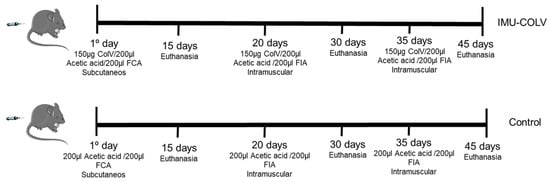 The control group (CT; n = 24) was inoculated with 10 mM acetic acid mixed with complete or incomplete Freund’s adjuvant, following the same immunization protocol. To investigate early pulmonary changes associated with experimental SSc, animals were euthanized at 15 (n = 10), 30 (n = 10), and 45 (n = 10) days after the initial COLV immunization. Before euthanasia, the mice were anesthetized with an intraperitoneal injection of ketamine hydrochloride (100 mg/kg body weight) and xylazine (10 mg/kg body weight), followed by euthanasia through nuchal dislocation.
