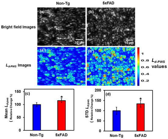 (a,b) Bright field images of Non-Tg and 5xFAD mice brain tissues (hippocampus) with their corresponding Ld-PWS colormaps (a’,b’). (c,d) 5xFAD shows increased mean (7.5%), and STD (6%) of Ld-PWS compared to Non-Tg. (* Student’s t-test, p < 0.05; n = 4 mice per group).