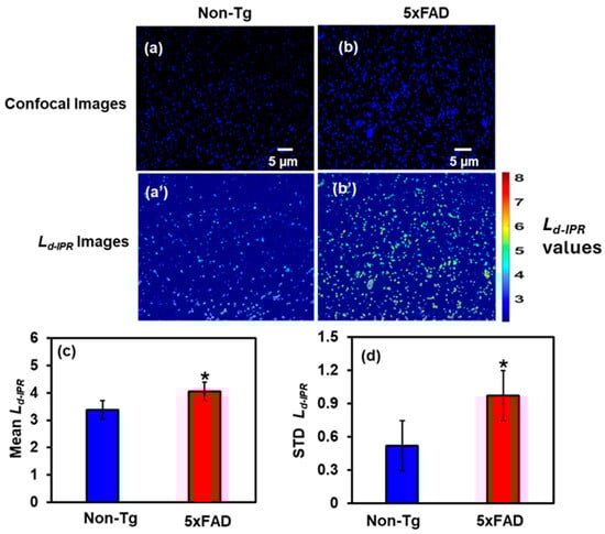 (a,b) The confocal images of Non-Tg and 5xFAD mice brain tissues (hippocampus) with their corresponding Ld-IPR colormaps (a’,b’). (c,d) 5xFAD shows increased mean (26%), and STD (19%) of Ld-IPR compared to Non-Tg. (* Student’s t-test, p < 0.05; n = 4 mice per group).