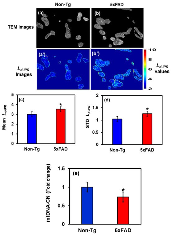 (a,b) Cropped TEM images of hippocampal mitochondria from Non-Tg and 5xFAD mice with their corresponding Ld-IPR colormaps (a’,b’). (c,d) 5xFAD shows an increase in mean (18%) and STD (21%) Ld-IPR values compared to Non-Tg. (* Student’s t-test, p < 0.05; n = 25–30 mitochondria per group). (e) Relative mtDNA copy number is reduced by 27% in 5xFAD hippocampus, showing impaired mitochondrial maintenance and bioenergetic stress. (* Student’s t-test, p < 0.05; n = 4 mice per group).