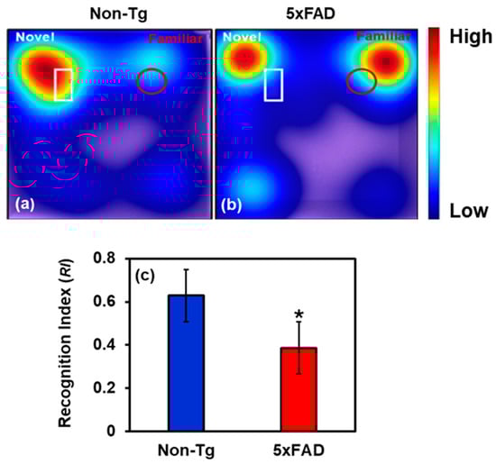 (a,b) Representative heat maps showing time spent by mice (Non-Tg and Control) near the novel (white-outlined) and familiar (red-outlined) object during the retention phase. (c) The recognition index is reduced by 38.5% in 7-month-old 5xFAD mice compared with Non-Tg, indicating impaired non-spatial recognition memory. (* Student’s t-test, p < 0.05; n = 6 mice per group.).