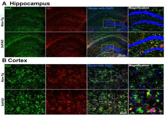 Representative immunofluorescence images of the hippocampus (A) and cortex (B) from 5xFAD and Non-Tg mouse brains. Sections were stained for microglia (Iba1, green) and Aβ plaques (4G8, red), with nuclei counterstained with DAPI (blue). Merged images are shown for each region. Insets represent higher-magnification views of the areas indicated by white dashed boxes in the corresponding low-magnification images. Compared with Non-Tg controls, 5xFAD brains exhibit increased Aβ plaque burden and enhanced microglial activation in both hippocampal and cortical regions (n = 4 mice per group were examined. Only one representative image per group is presented here.). Hippocampal images were acquired at 5× magnification (scale bar = 500 μm), and cortical images at 20× magnification (scale bar = 100 μm).