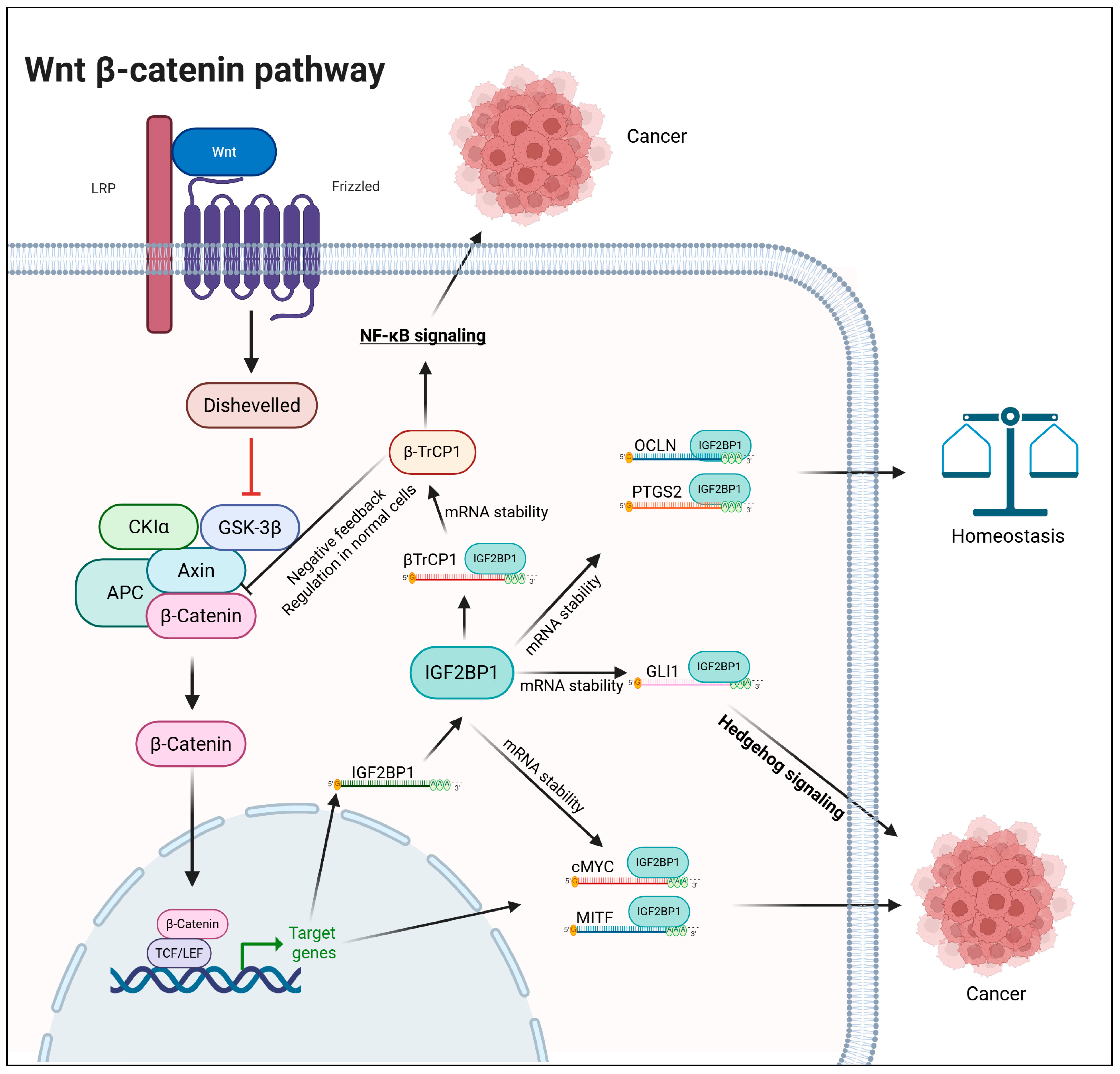 - Singh, V.; Walter, V.; Elcheva, I.; Imamura Kawasawa, Y.; Spiegelman, V.S. Global role of IGF2BP1 in controlling the expression of Wnt/β-catenin-regulated genes in colorectal cancer cells. Front. Cell Dev. Biol. 2023, 11, 1236356. [Google Scholar] [CrossRef] [PubMed]
