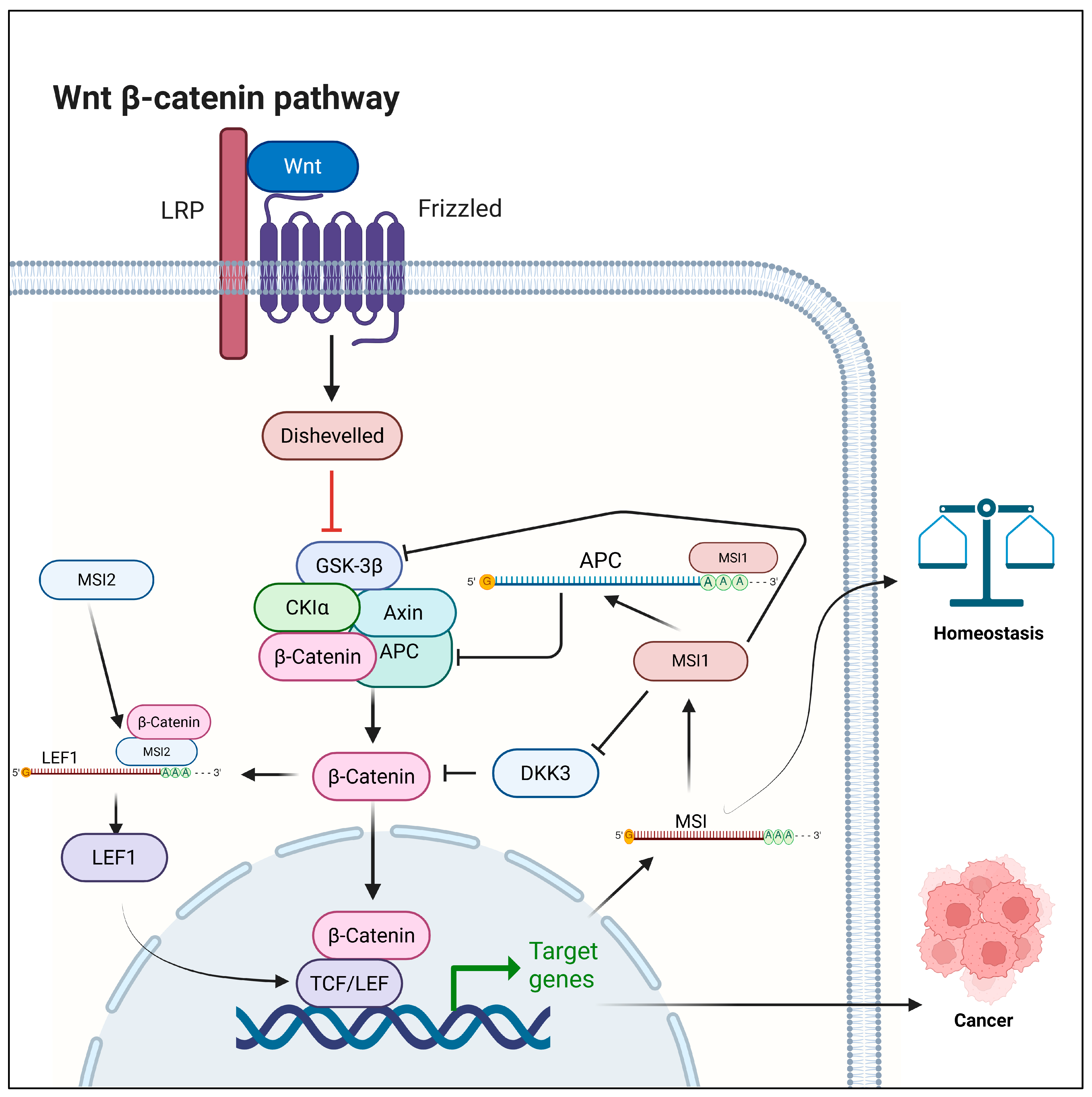 - Wagstaff, M.; Sevim, O.; Goff, A.; Raynor, M.; Park, H.; Mancini, E.J.; Nguyen, D.T.T.; Chevassut, T.; Blair, A.; Castellano, L.; et al. β-Catenin interacts with canonical RBPs including MSI2 to associate with a Wnt signalling mRNA network in myeloid leukaemia cells. Oncogene 2025, 44, 2490–2503. [Google Scholar] [CrossRef]