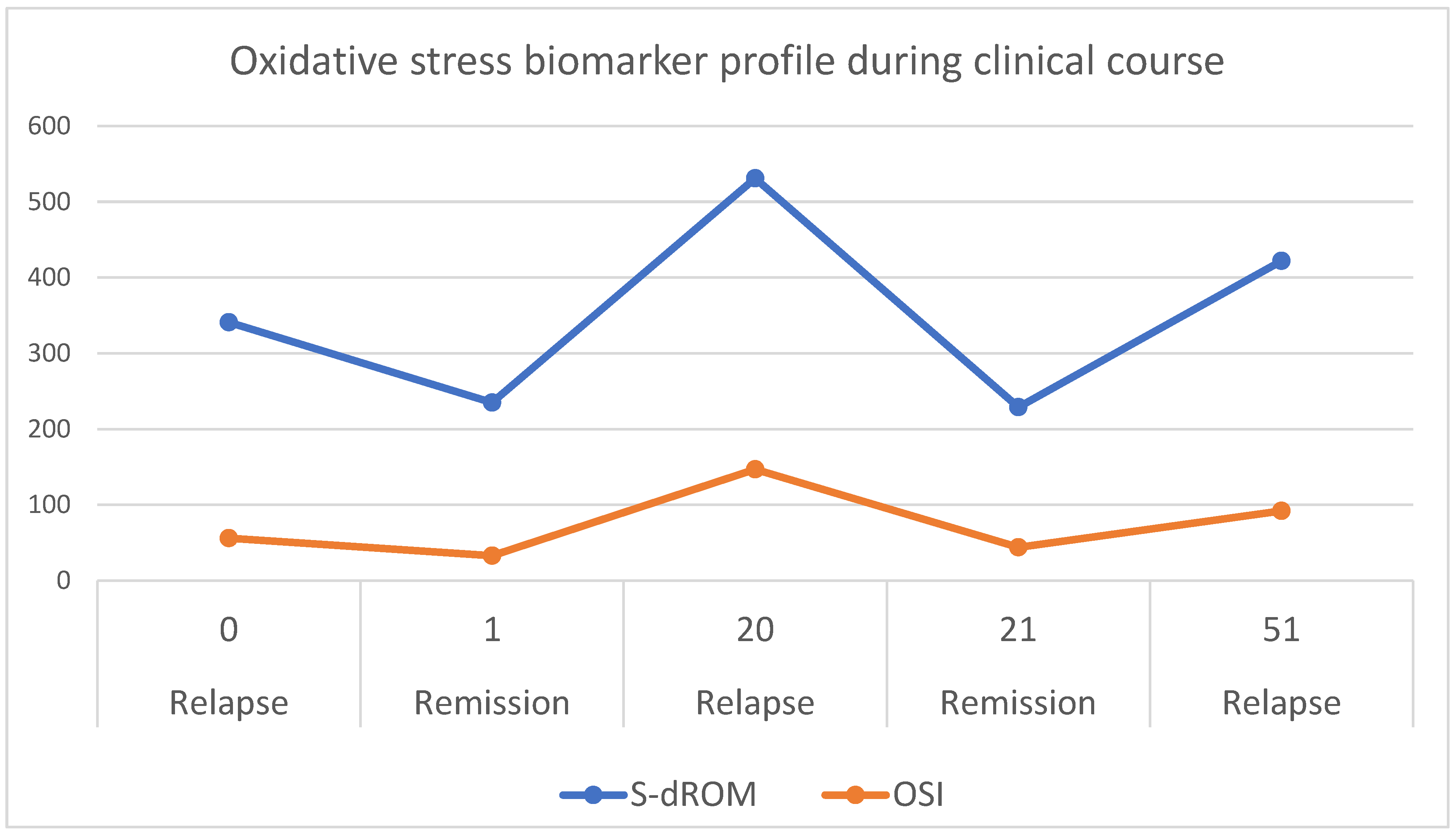 Figure 1 illustrates the temporal changes in d-ROM and OSI values across the five clinical stages. The d-ROM and OSI curves show a pronounced peak during relapses, reflecting illness activity: declining during remission and rising during relapse, caused by dynamic balance between oxidative stress and antioxidant defense.