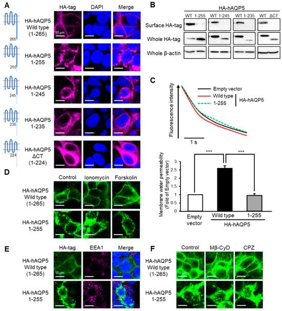 Ten amino acid residues between Arg256 and Arg265 are required for plasma membrane localization of AQP5. HEK-293 cells transfected with hAQP5 C-terminal deletion mutants were analyzed for the cellular localization of the mutants by immunofluorescence (A) and assessed for the level of cell surface mutants by cell surface biotinylation and Western blotting (B). Membrane water permeability of CHO-K1 cells transfected with hAQP5 1–255 was measured using the calcein quenching method at 37 °C. Each data point represents mean ± SE (n = 3), *** p < 0.001 (C). HEK-293 cells transfected with hAQP5 1–255 were treated with ionomycin (1 µM) or forskolin (10 µM) for 15 min. The cellular localization of the mutants was analyzed by immunofluorescence (D). HEK-293 cells transfected with hAQP5 1–255 were analyzed for the cellular localization of the mutants and EEA1 by immunofluorescence (E). HEK-293 cells transfected with hAQP5 1–255 were treated with methyl-β-cyclodextrin (Mβ-CyD, 1 mM) or chlorpromazine (CPZ, 10 µg/mL) for 12 h. The cellular localization of the mutants was analyzed by immunofluorescence (F). Typical data in triplicated experiments are shown.