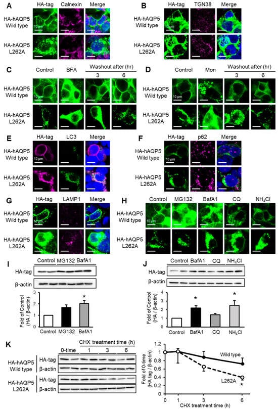 C-terminal domain mutant of AQP5 localizes to autophagosome or lysosome and is degraded via autophagy. HEK-293 cells transfected with hAQP5 wild-type or L262A were analyzed for the cellular localization of the mutants, calnexin (A) or TGN38 (B), by immunofluorescence. HEK-293 cells transfected with hAQP5 wild-type or L262A were treated with brefeldin A ((C), BFA, 5 µg/mL) or monensin ((D), Mon, 10 µM) for 12 h, after which the cells were washed out and incubated for 3 or 6 h. The cellular localization of the mutants was assessed by immunofluorescence. HEK-293 cells transfected with hAQP5 wild-type or L262A with LC3-GFP were analyzed for the cellular localization of the mutants and LC3 by immunofluorescence (E). HEK-293 cells transfected with hAQP5 wild-type or L262A were analyzed for the cellular localization of the mutants, p62 (F), or LAMP1 (G), by immunofluorescence. HEK-293 cells transfected with hAQP5 L262A were treated with MG132 (10 µM), bafilomycin A1 (BafA1, 500 nM), chloroquine (CQ, 20 µM), or ammonium chloride (10 µM) for 12 h. The cellular localization of the mutants was analyzed by immunofluorescence (H). The level of whole-cell mutants was analyzed by Western blotting. Each data point represents mean ± SE (n = 3), * p < 0.05 vs. control (I,J). HEK-293 cells transfected with hAQP5 wild-type and L262A were treated with cycloheximide (100 µg/mL) for 1, 3, 6, or 12 h. The level of whole-cell mutants was analyzed by Western blotting. Each data represents mean ± SE (n = 4), * p < 0.05 vs. control (K). Typical data in triplicated experiments are shown.