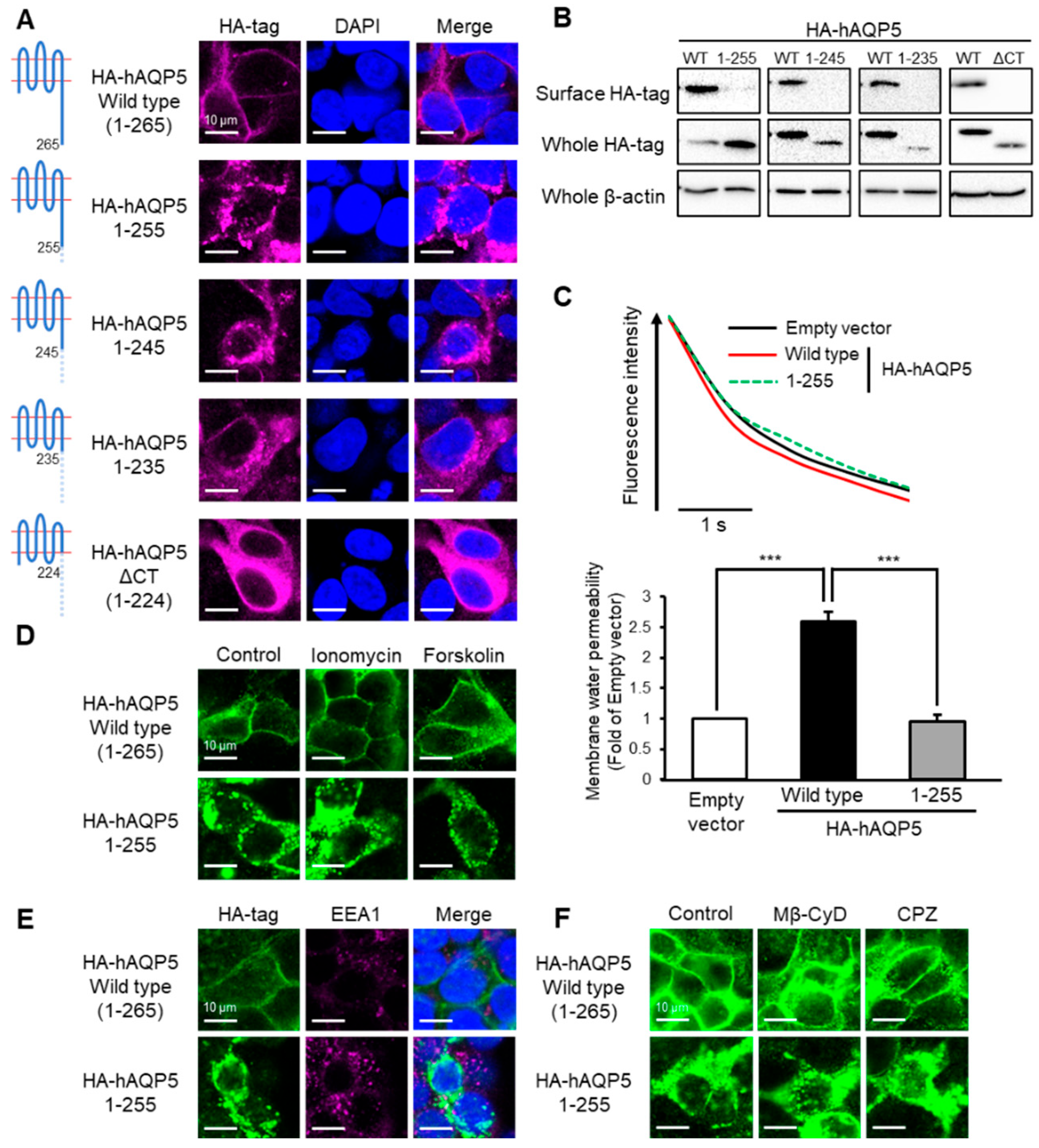 Figure 2. Ten amino acid residues between Arg256 and Arg265 are required for plasma membrane localization of AQP5. HEK-293 cells transfected with hAQP5 C-terminal deletion mutants were analyzed for the cellular localization of the mutants by immunofluorescence (A) and assessed for the level of cell surface mutants by cell surface biotinylation and Western blotting (B). Membrane water permeability of CHO-K1 cells transfected with hAQP5 1–255 was measured using the calcein quenching method at 37 °C. Each data point represents mean ± SE (n = 3), *** p < 0.001 (C). HEK-293 cells transfected with hAQP5 1–255 were treated with ionomycin (1 µM) or forskolin (10 µM) for 15 min. The cellular localization of the mutants was analyzed by immunofluorescence (D). HEK-293 cells transfected with hAQP5 1–255 were analyzed for the cellular localization of the mutants and EEA1 by immunofluorescence (E). HEK-293 cells transfected with hAQP5 1–255 were treated with methyl-β-cyclodextrin (Mβ-CyD, 1 mM) or chlorpromazine (CPZ, 10 µg/mL) for 12 h. The cellular localization of the mutants was analyzed by immunofluorescence (F). Typical data in triplicated experiments are shown.