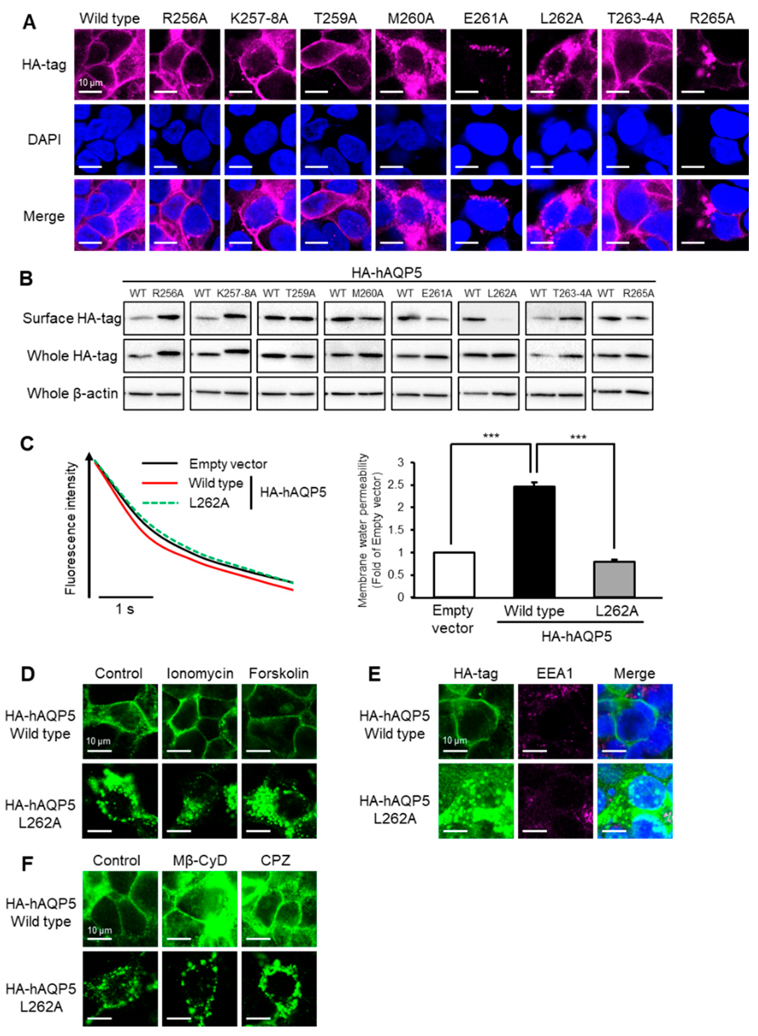 Figure 3. Leu262 is required for plasma membrane localization of AQP5. HEK-293 cells transfected with hAQP5 C-terminal point mutants were analyzed for the cellular localization of the mutants by immunofluorescence (A) and assessed for the level of cell surface mutants by cell surface biotinylation and Western blotting (B). Membrane water permeability of CHO-K1 cells transfected with hAQP5 L262A was measured using the calcein quenching method at 37 °C. Each data point represents mean ± SE (n = 3), *** p < 0.001 (C). HEK-293 cells transfected with hAQP5 L262A were treated with ionomycin (1 µM) or forskolin (10 µM) for 15 min. The cellular localization of the mutants was analyzed by immunofluorescence (D). HEK-293 cells transfected with hAQP5 L262A were analyzed for the cellular localization of the mutants and EEA1 by immunofluorescence (E). HEK-293 cells transfected with hAQP5 L262A were treated with methyl-β-cyclodextrin (Mβ-CyD, 1 mM) or chlorpromazine (CPZ, 10 µg/mL) for 12 h. The cellular localization of the mutants was analyzed by immunofluorescence (F). Typical data in triplicated experiments are shown.