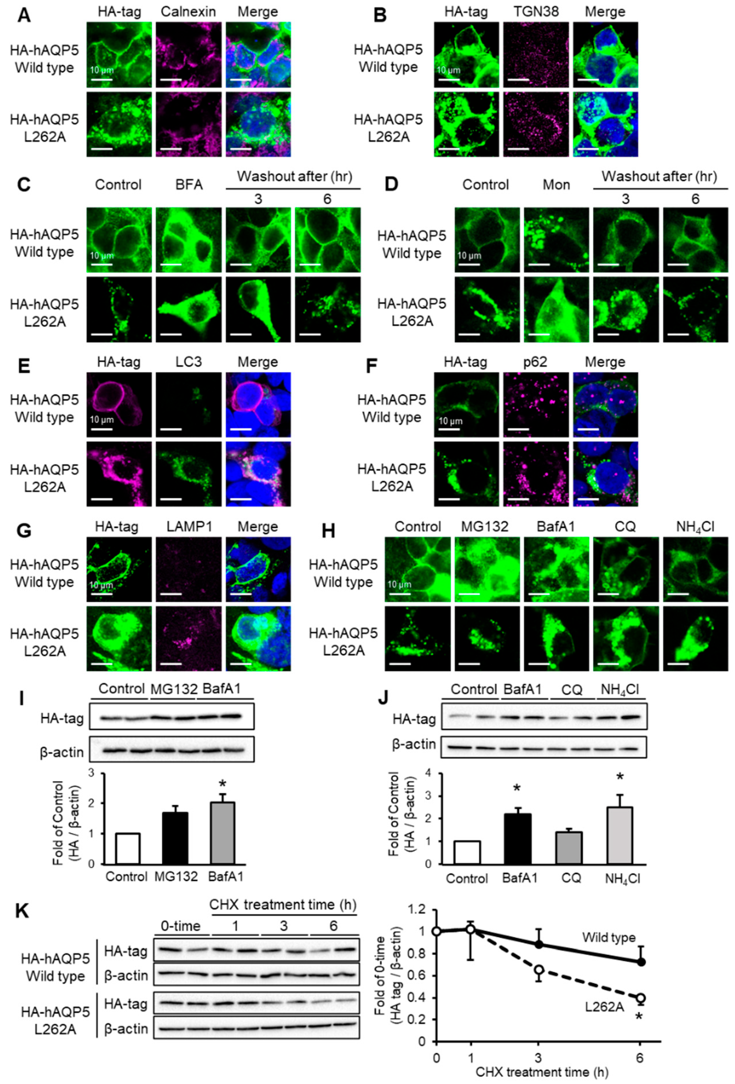 Figure 4. C-terminal domain mutant of AQP5 localizes to autophagosome or lysosome and is degraded via autophagy. HEK-293 cells transfected with hAQP5 wild-type or L262A were analyzed for the cellular localization of the mutants, calnexin (A) or TGN38 (B), by immunofluorescence. HEK-293 cells transfected with hAQP5 wild-type or L262A were treated with brefeldin A ((C), BFA, 5 µg/mL) or monensin ((D), Mon, 10 µM) for 12 h, after which the cells were washed out and incubated for 3 or 6 h. The cellular localization of the mutants was assessed by immunofluorescence. HEK-293 cells transfected with hAQP5 wild-type or L262A with LC3-GFP were analyzed for the cellular localization of the mutants and LC3 by immunofluorescence (E). HEK-293 cells transfected with hAQP5 wild-type or L262A were analyzed for the cellular localization of the mutants, p62 (F), or LAMP1 (G), by immunofluorescence. HEK-293 cells transfected with hAQP5 L262A were treated with MG132 (10 µM), bafilomycin A1 (BafA1, 500 nM), chloroquine (CQ, 20 µM), or ammonium chloride (10 µM) for 12 h. The cellular localization of the mutants was analyzed by immunofluorescence (H). The level of whole-cell mutants was analyzed by Western blotting. Each data point represents mean ± SE (n = 3), * p < 0.05 vs. control (I,J). HEK-293 cells transfected with hAQP5 wild-type and L262A were treated with cycloheximide (100 µg/mL) for 1, 3, 6, or 12 h. The level of whole-cell mutants was analyzed by Western blotting. Each data represents mean ± SE (n = 4), * p < 0.05 vs. control (K). Typical data in triplicated experiments are shown.