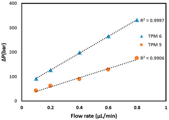 Linear relationship between flow rate and backpressure for the columns TPM 5 and 6.