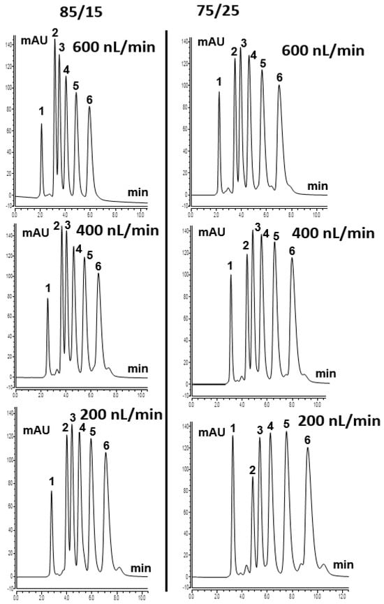 ABs separation can be attributed to the logarithmic methylene group selectivity (logαCH2) [18]. TPM 6 column was also tested using various ACN content from 75% to 85% in the mobile phase. Homologous ABs were well separated on the column at a higher content of ACN, which shows the typical RP mechanism. Figure 4 shows the separation chromatograms of homologous ABs with different ACN content at various flow rates. At the more aqueous 75/25 ACN/H2O (v/v) conditions, decreasing the flow rate from 400 to 200 nL/min increases the residence time of the mobile phase within the highly hydrophobic 4-TPM monolith. For the weakly retained polar compound uracil, this longer residence time slightly increases its dispersion and apparent breakthrough volume. Consequently, a larger proportion of uracil elutes within the acquisition window at 200 nL/min. In contrast, methylbenzene interacts more strongly with the hydrophobic stationary phase. At the lower flow rate, its retention and partial on-column focusing are enhanced. This results in a lower eluted amount under identical gradient and detection conditions. Overall, the results showed that the developed TPM 6 column could be used to separate hydrophobic compounds and that the column indicated an RP separation mechanism originating from 4-TPM, as described in the literature [19].