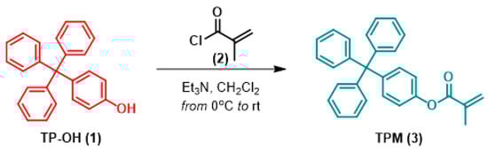 The synthesis route for the 4-TPM monomer is shown in Figure 8. As illustrated, the synthesis of the target compound (3,4-TPM) was performed as outlined in the literature [27]. The 4-Tritylphenol (TP-OH, 1.0 g, 2.97 mmol) was dissolved in dry CH2Cl2 (50 mL). Triethylamine (Et3N) (1.5 equivalents, 0.60 mL) was then added to the solution. The reaction was kept at 0 °C while methacryloyl chloride (2, 1.5 equivalents, 0.43 mL) in CH2Cl2 (10 mL) was added dropwise via a dropping funnel over about 30 min.