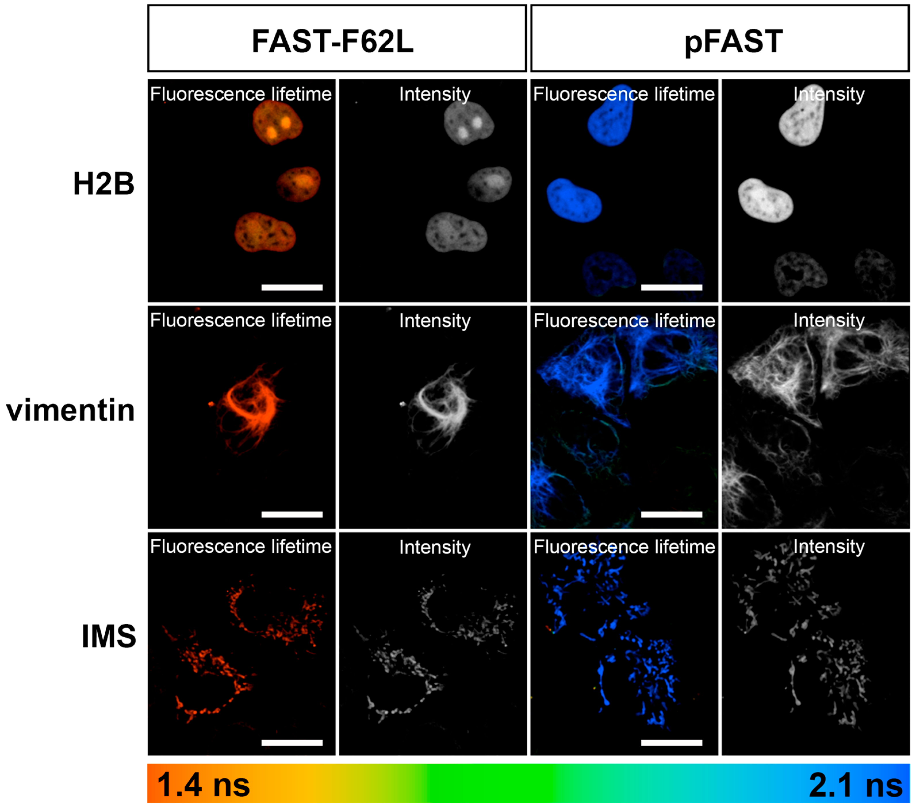 Finally, dual-localization FLIM-based discrimination was performed by co-expressing pFAST and FAST-F62L as fusion constructs targeting vimentin and H2B, respectively, in live HeLa Kyoto cells (