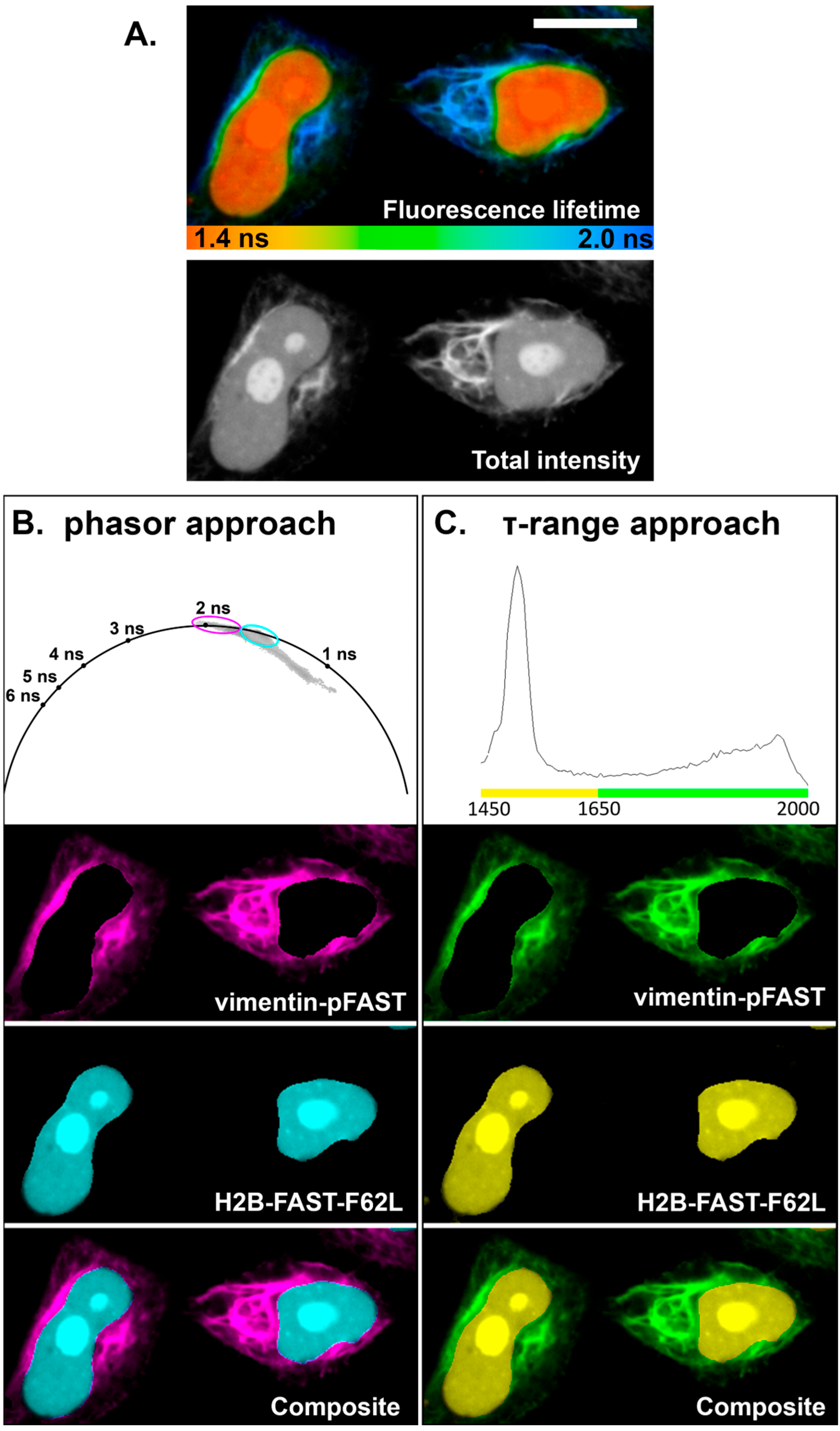 –HBTR-3,5-DOM] complex based on lifetime distribution histograms or phasor plots, respectively. For dual-localization FLIM of cells co-expressing vimentin and H2B-FAST variant fusion constructs, these τ ranges or phasor clusters were used to discriminate cellular compartments.