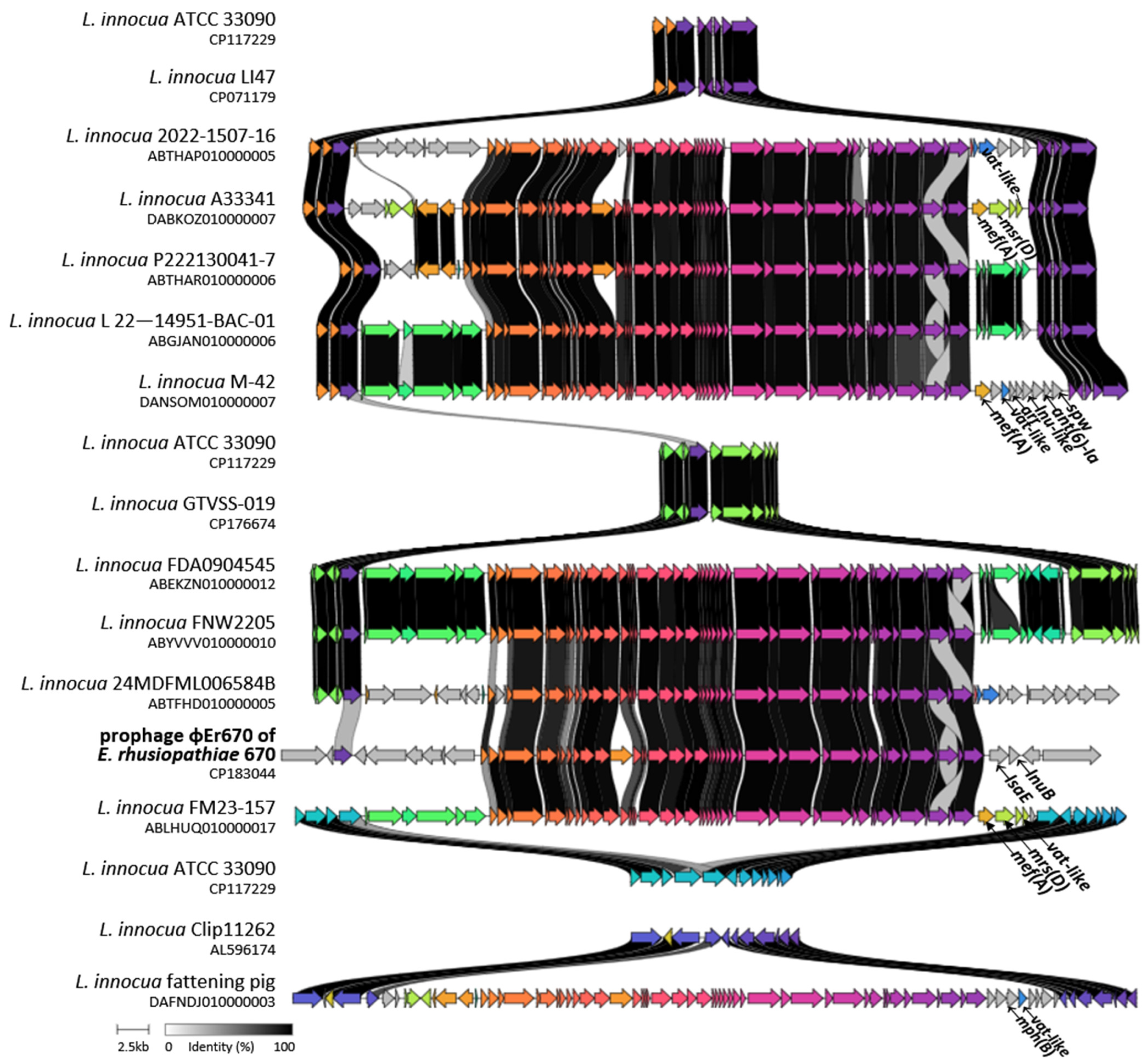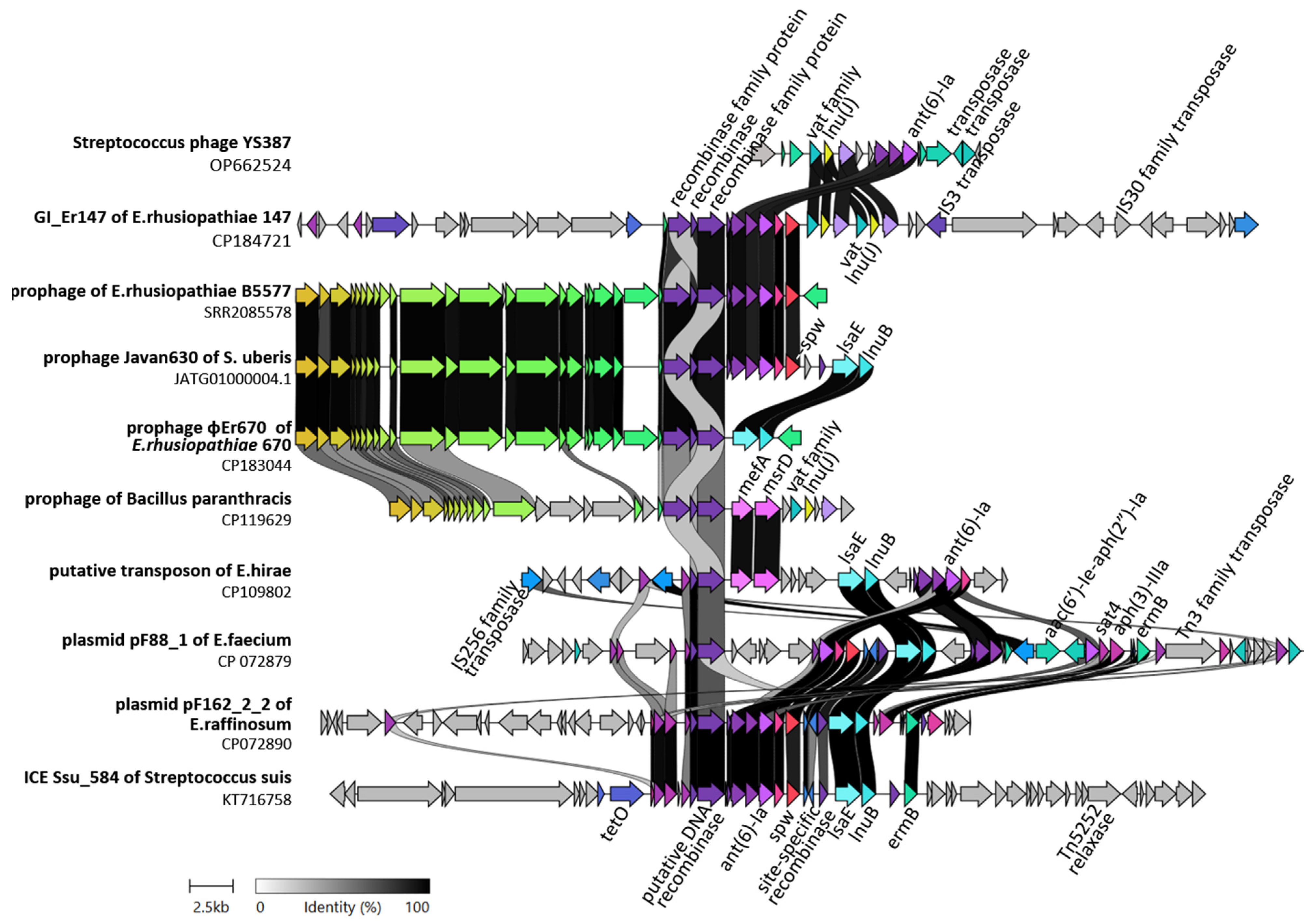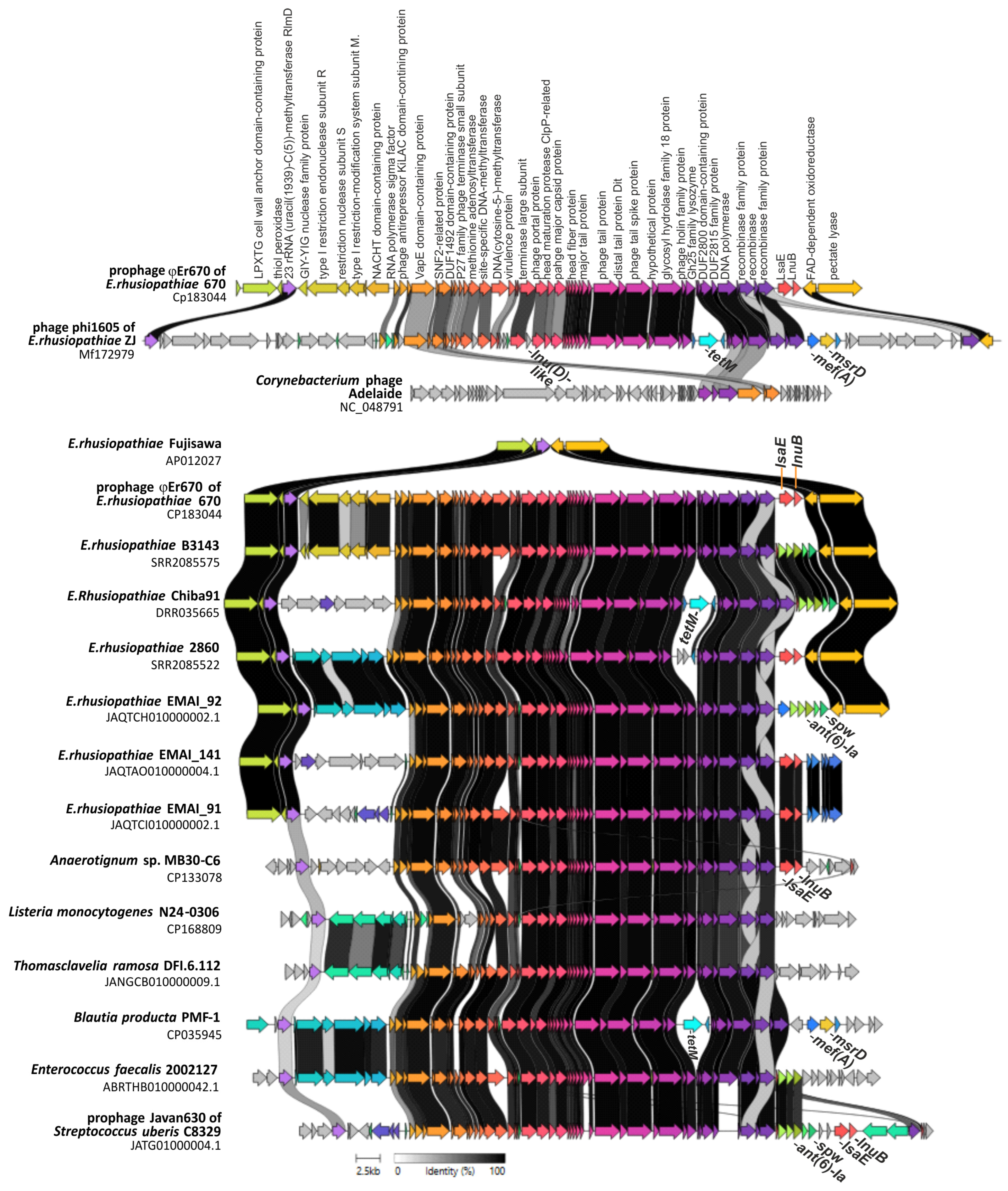 | E.rhusiopathiae (prophageφEr670) | 670 | 53 | lsaE, lnuB | NA | NA | 100 | CP183044.1 | This study |