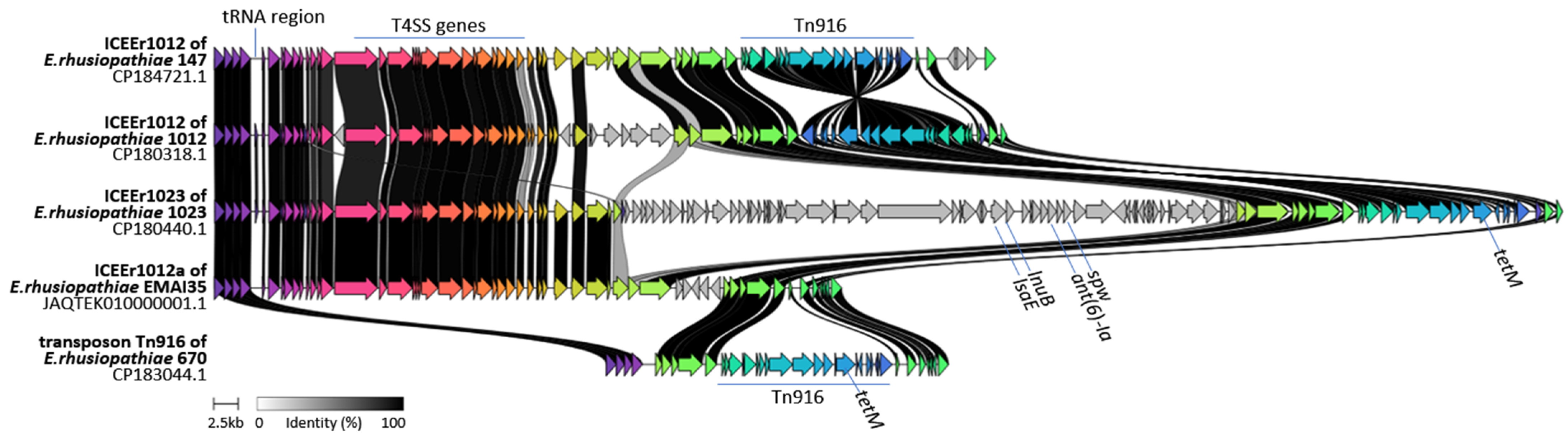 - Bellanger, X.; Payot, S.; Leblond-Bourget, N.; Guédon, G. Conjugative and mobilizable genomic islands in bacteria: Evolution and diversity. FEMS Microbiol. Rev. 2014, 38, 720–760. [Google Scholar] [CrossRef]