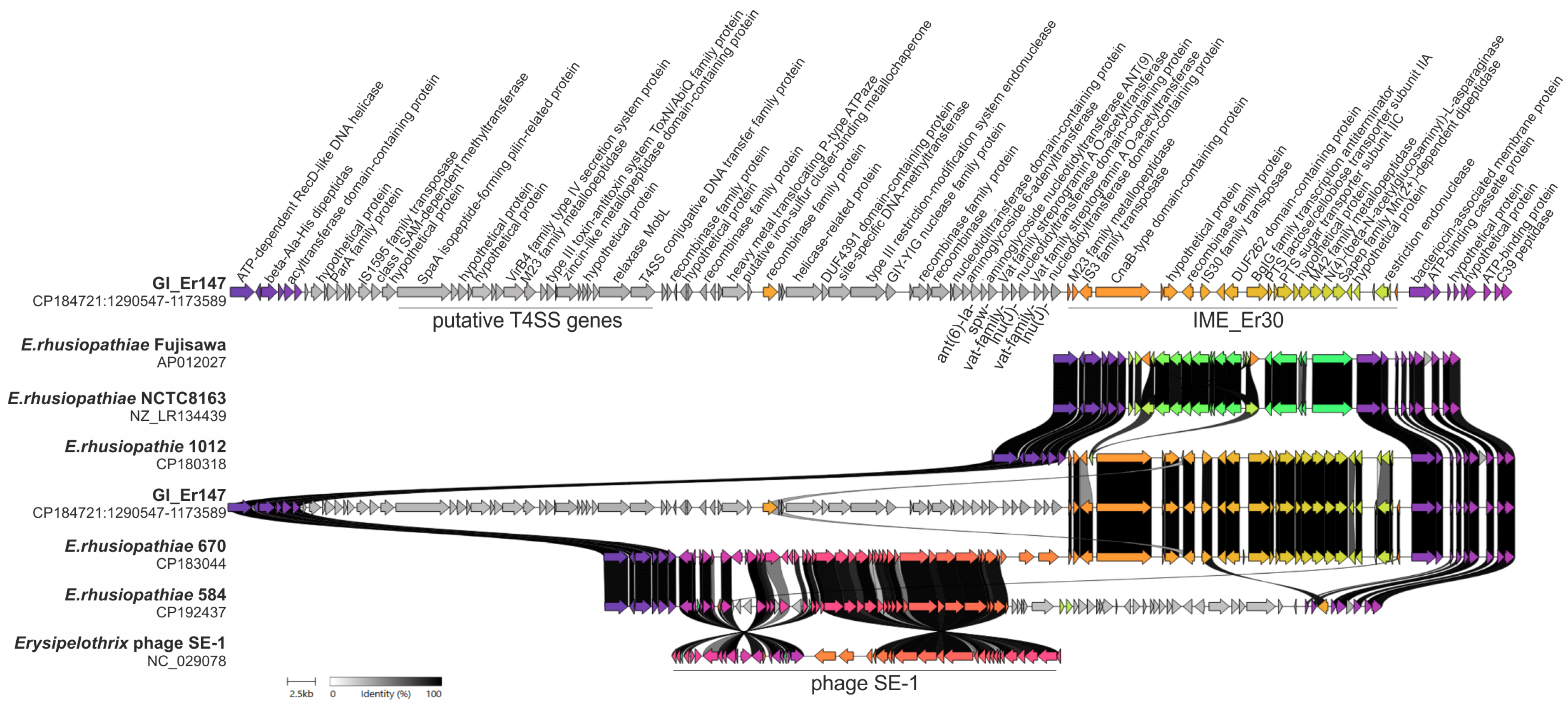 | E.rhusiopathiae | Chiba 92B | 56.5 | spw, ant(6)-Ia, tetM | 73 | 94.1 | 94.7 | DRR035668 | [18] |