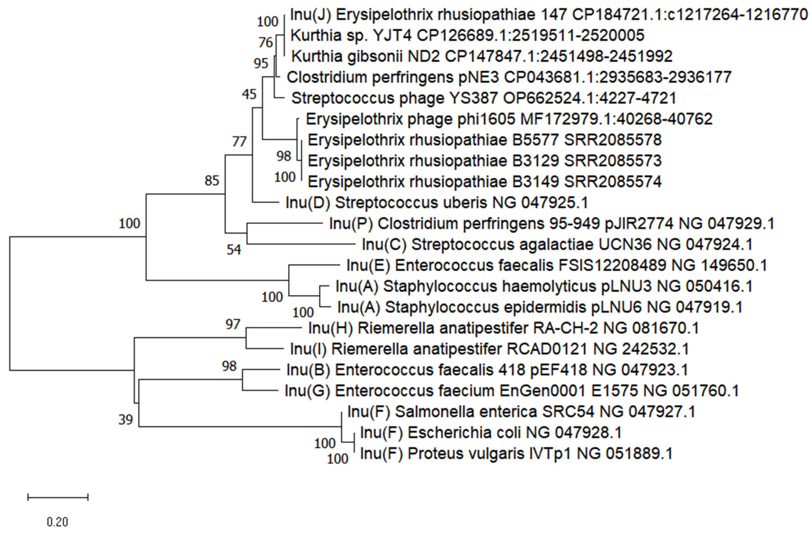 - Wu, C.; Lv, C.; Zhao, Y.; Zhu, W.; Liu, L.; Wang, T.; Kang, C.; Yang, Y.; Sun, X.; Zhang, Q.; et al. Characterization of Erysipelothrix rhusiopathiae isolates from diseased pigs in 15 Chinese provinces from 2012 to 2018. Microorganisms 2021, 9, 2615. [Google Scholar] [CrossRef]