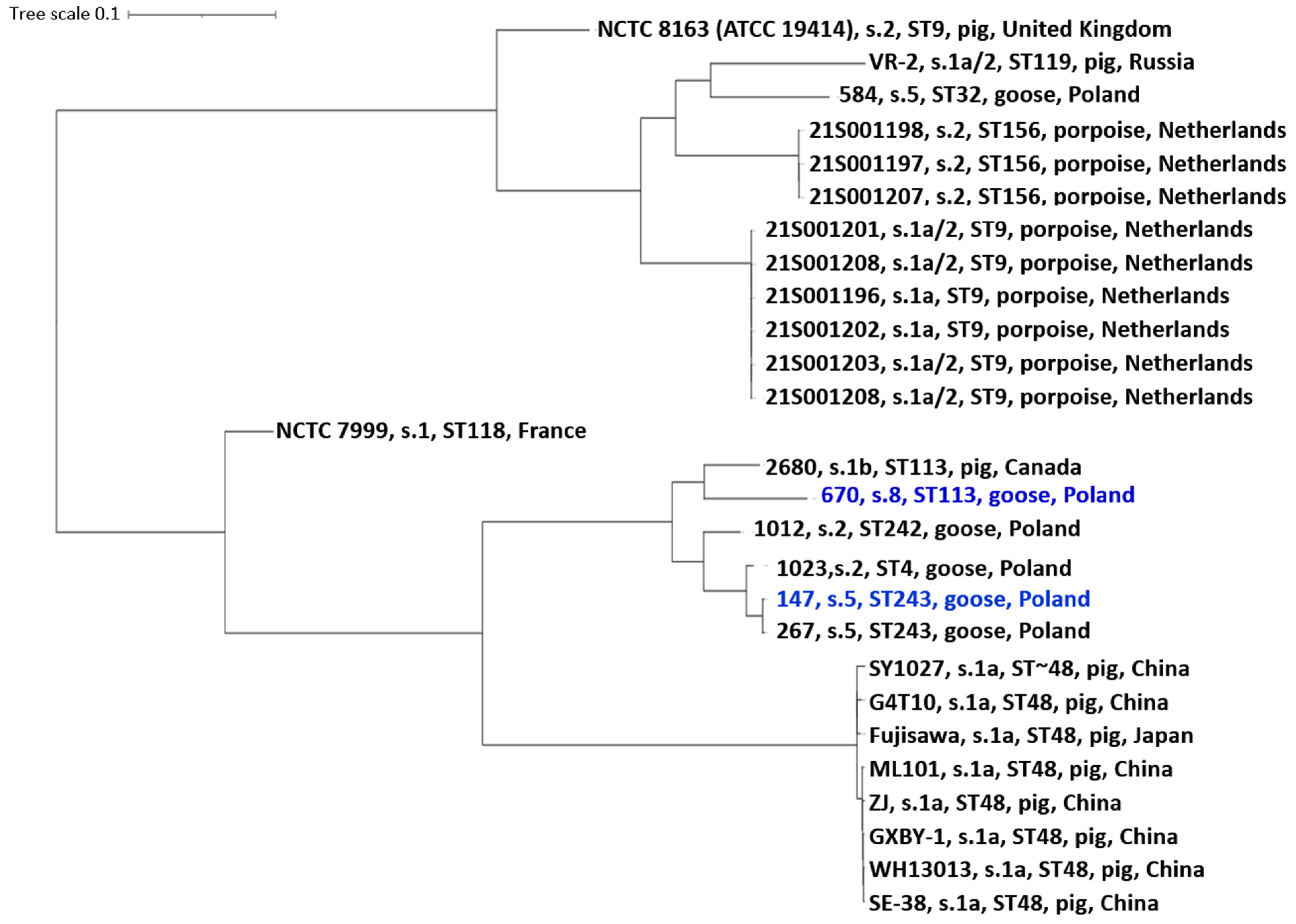 - IJsseldijk, L.L.; Begeman, L.; Duim, B.; Gröne, A.; Kik, M.J.L.; Klijnstra, M.D.; Lakemeyer, J.; Leopold, M.F.; Munnink, B.B.O.; Ten Doeschate, M.; et al. Harbor porpoise deaths associated with Erysipelothrix rhusiopathiae, the Netherlands, 2021. Emerg. Infect. Dis. 2023, 29, 835–838. [Google Scholar] [CrossRef]