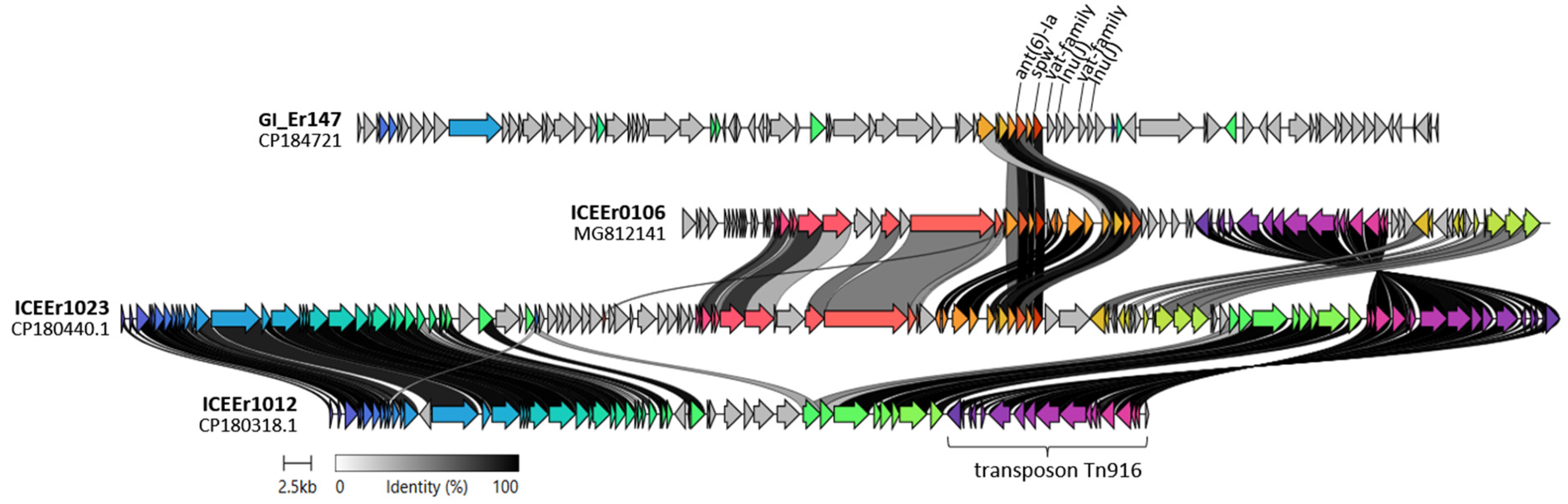 - Flannagan, S.E.; Zitzow, L.A.; Su, Y.A.; Clewell, D.B. Nucleotide sequence of the 18-kb conjugative transposon Tn916 from Enterococcus faecalis. Plasmid 1994, 32, 350–354. [Google Scholar] [CrossRef] [PubMed]