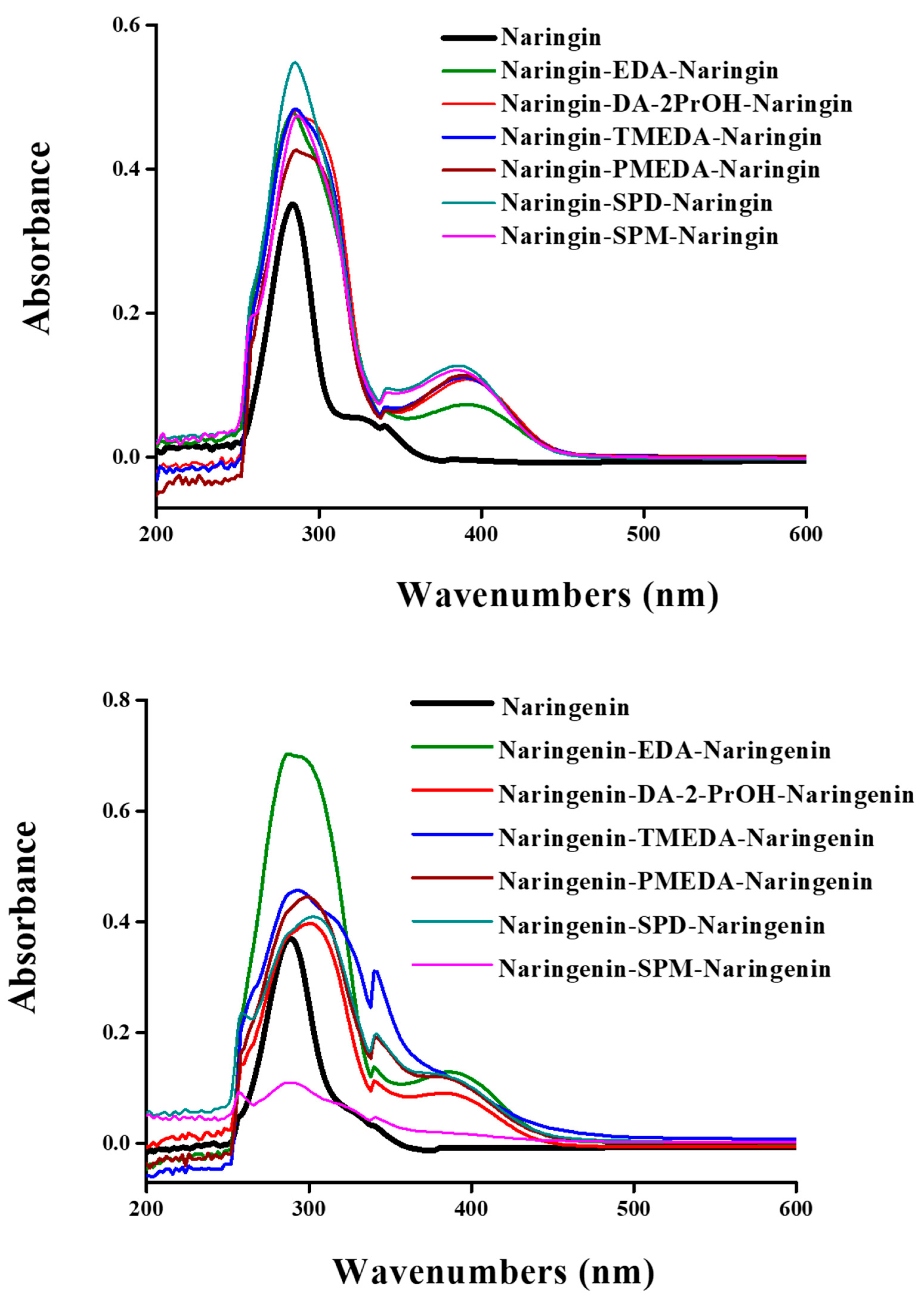 | Naringenin-SPM-Naringenin | 3402/3211 | 2930 | 1592 | 1171–1060 | 288/385 | 4987/1063 |