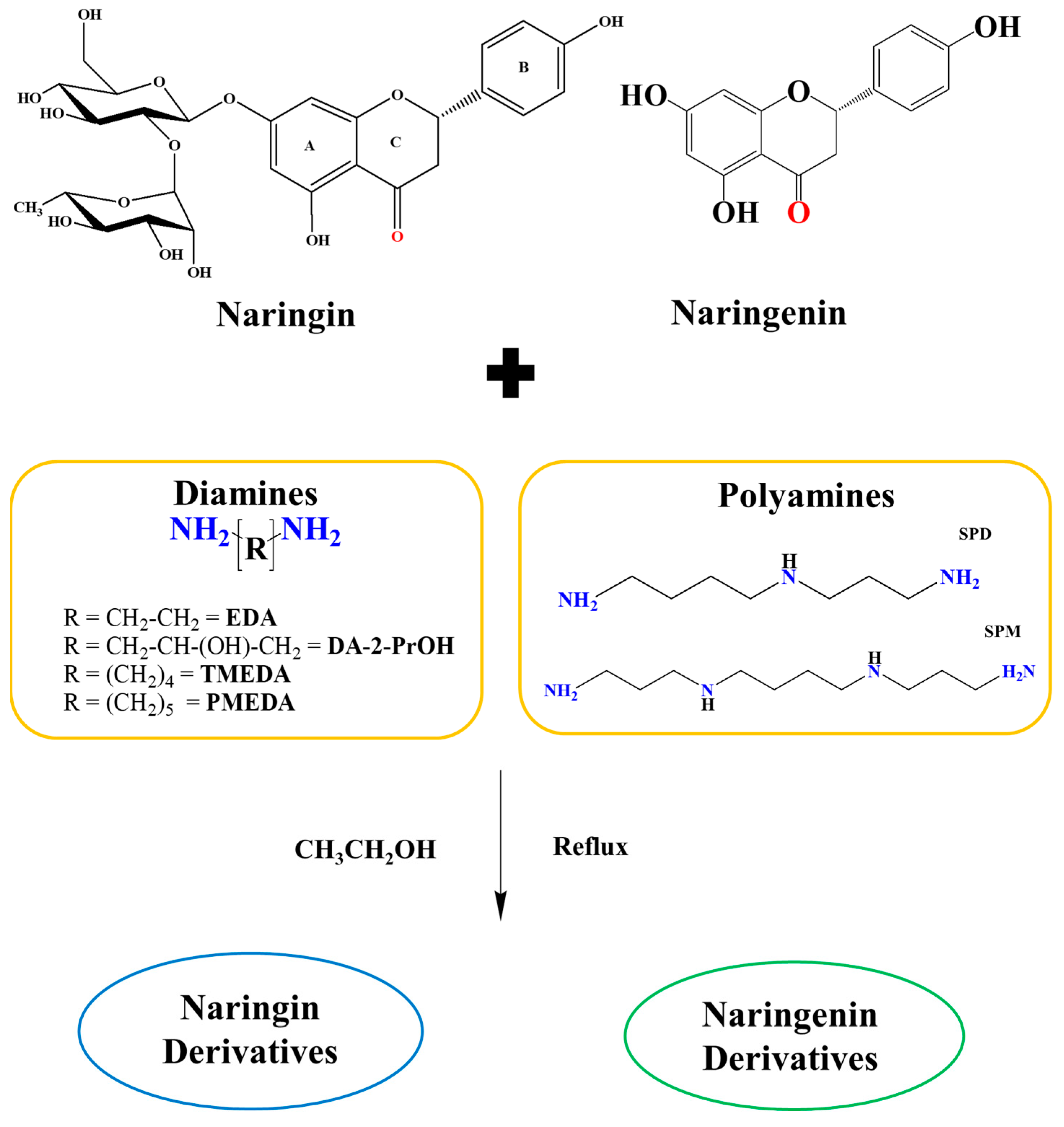 - Brodowska, K.; Sykuła, A.; Garribba, E.; Łodyga-Chruścińska, E.; Sójka, M. Naringenin Schiff base: Antioxidant activity, acid–base profile, and interactions with DNA. Transit. Met. Chem. 2016, 41, 179–189. [Google Scholar] [CrossRef]