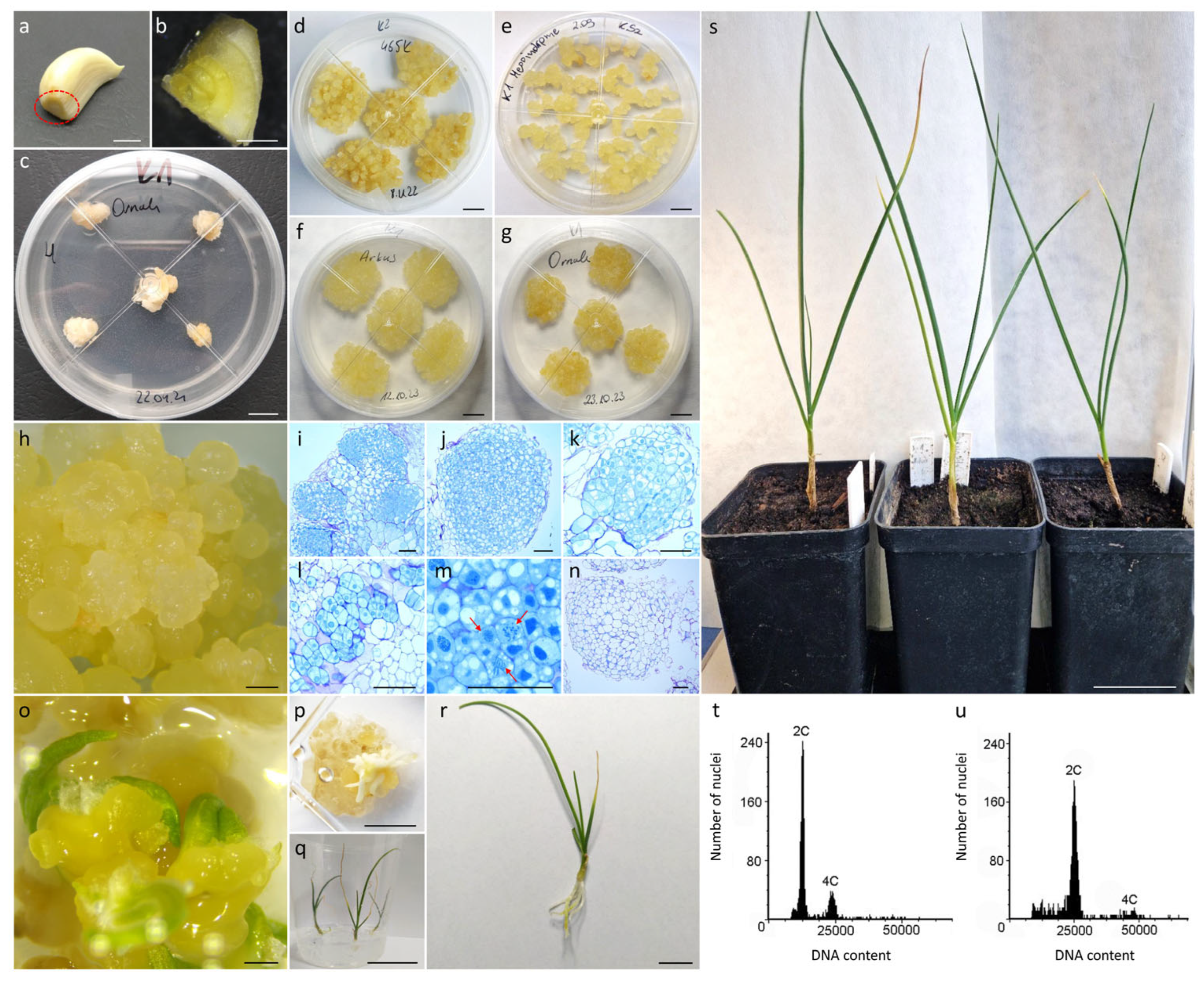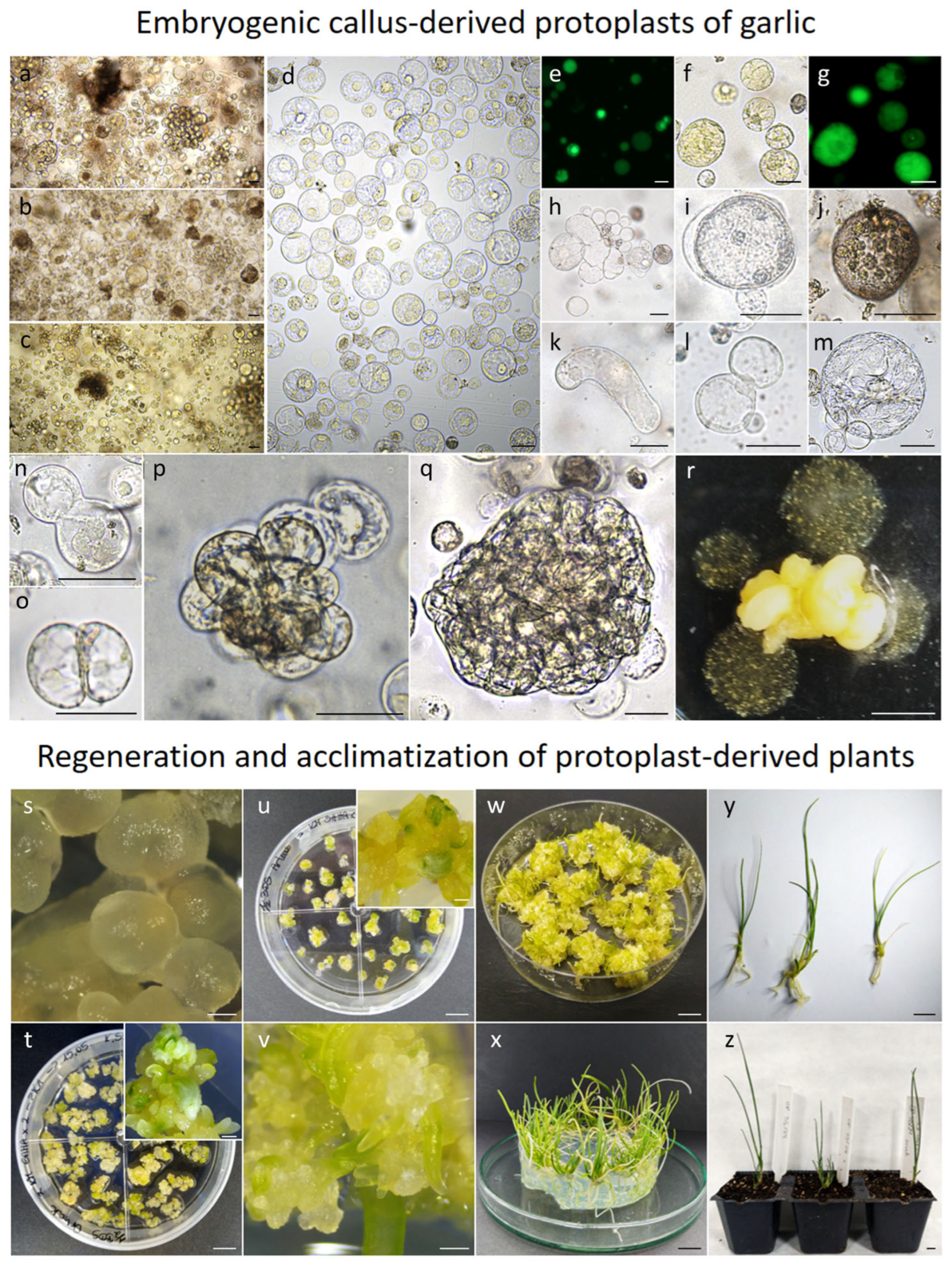 - Hasegawa, H.; Sato, M.; Suzuki, M. Efficient plant regeneration from protoplasts isolated from long-term, shoot primordia-derived calluses of garlic (Allium sativum). J. Plant Physiol. 2002, 159, 449–452. [Google Scholar] [CrossRef]