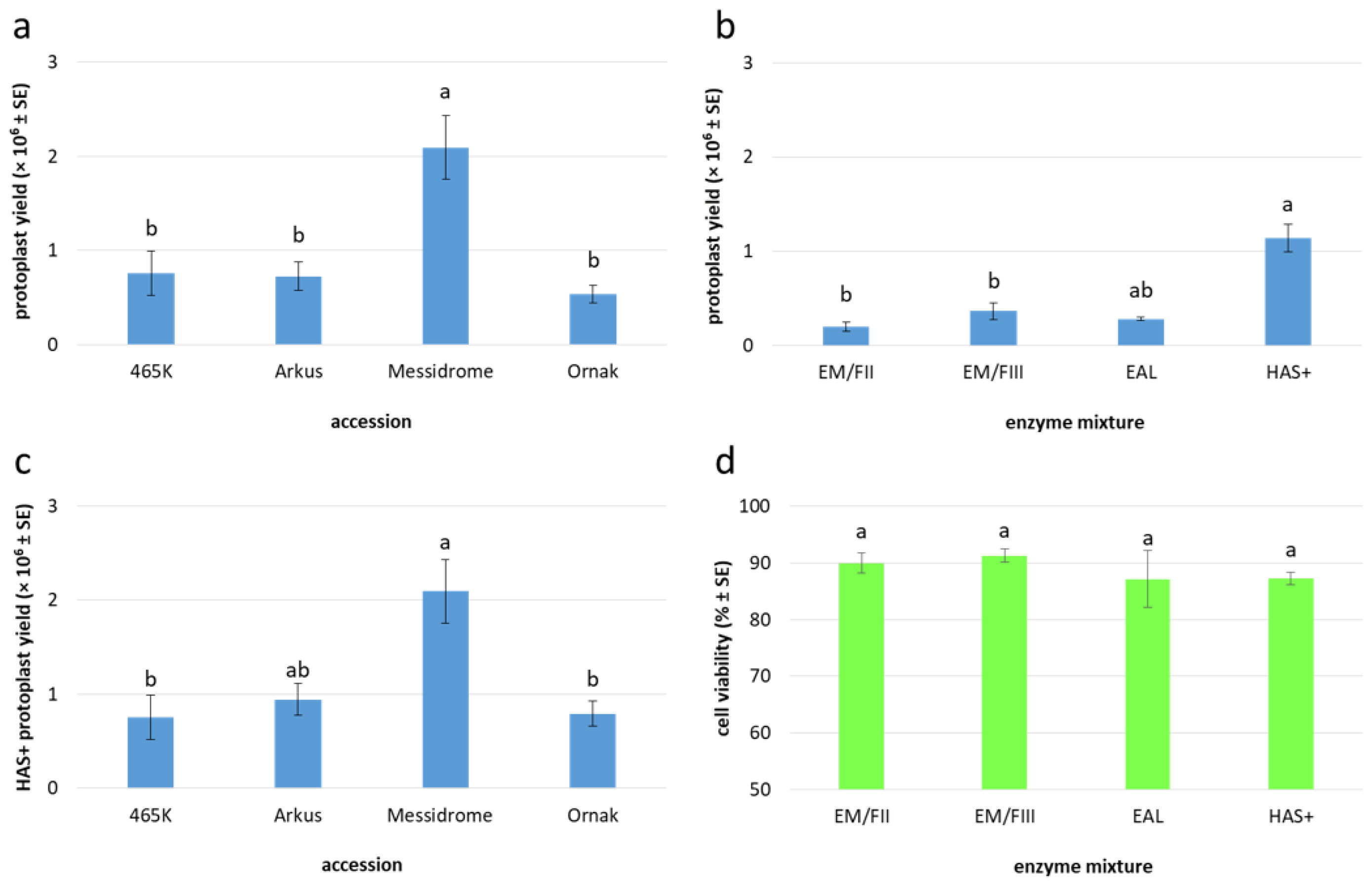| Accession | Enzyme Mixture | Callus Age (Days) | n | Protoplast Yield (×106/g FM) [Mean ± SE] | Protoplast Viability (%) [Mean ± SE] |