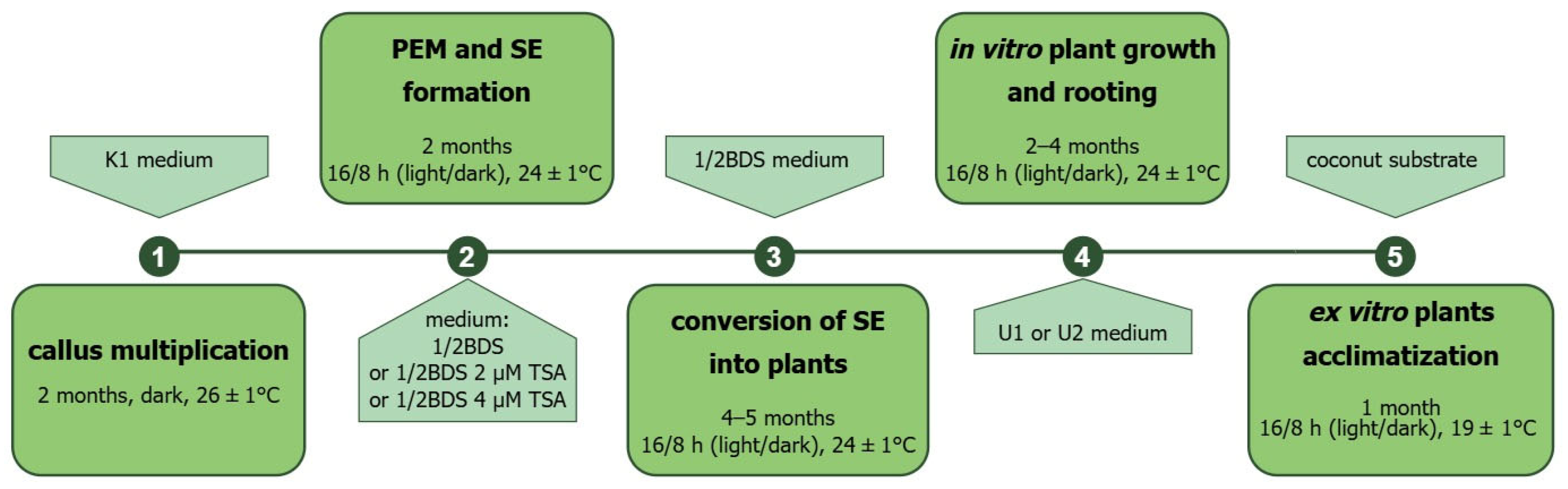 | K8M medium [53] | KM micro- and macroelements ([53]; Duchefa), 100 mg L−1 myo-inositol (Duchefa), 0.01 mg L−1 retinyl acetate (Sigma), 1 mg L−1 thiamine (Sigma), 0.2 mg L−1 riboflavin (Sigma), 1 mg L−1 nicotinamide (Sigma), 1 mg L−1 D-calcium pantothenate (Duchefa), 1 mg L−1 pyridoxine (Sigma), 0.01 mg L−1 biotin (Duchefa), 0.4 mg L−1 folic acid (Duchefa), 0.02 mg L−1 cyanocobalamin (Sigma), 2 mg L−1 ascorbic acid (Duchefa), 0.01 mg L−1 cholecalciferol, 20 mg L−1 sodium pyruvate (Sigma), 40 mg L−1 citric acid (Sigma), 40 mg L−1 malic acid (Sigma), 40 mg L−1 fumaric acid (Sigma), 1 mg L−1 choline chloride (Sigma), 0.02 mg L−1 p-aminobenzoic acid (Sigma), 68.4 g L−1 glucose (POCH), 250 mg L−1 sucrose (POCH), 250 mg L−1 fructose (Duchefa), 250 mg L−1 ribose (Duchefa), 250 mg L−1 xylose (Duchefa), 250 mg L−1 mannose (Duchefa), 250 mg L−1 rhamnose (Duchefa), 250 mg L−1 cellobiose (Sigma), 250 mg L−1 sorbitol (POCH), 250 mg L−1 mannitol (Sigma), 0.6 mg L−1 L-alanine, 0.1 mg L−1 L-arginine-HCl, 0.1 mg L−1 L-asparagine, 0.1 mg L−1 aspartic acid, 0.2 mg L−1 L-cysteine, 0.1 mg L−1 L-cystine, 0.6 mg L−1 L-glutamic acid, 5.6 mg L−1 L-glutamine, 0.1 mg L−1 L-glycine, 0.1 mg L−1 L-histidine hydrochloride, 0.1 mg L−1 4-hydroxyproline, 0.1 mg L−1 L-isoleucine, 0.1 mg L−1 L-leucine, 0.1 mg L−1 L-lysine hydrochloride, 0.1 mg L−1 L-methionine, 0.1 mg L−1 L-phenylalanine, 0.1 mg L−1 L-proline, 0.1 mg L−1 L-serine, 0.1 mg L−1 L-threonine, 0.1 mg L−1 L-tryptophan, 0.1 mg L−1 L-tyrosine, 0.1 mg L−1 L-valine (all amino acids provided by Sigma), 0.1 mg L−1 adenine (Sigma), 0.3 mg L−1 guanine (Sigma), 0.3 mg L−1 thymine (Sigma), 0.3 mg L−1 uracil (Sigma), 0.015 mg L−1 hypoxanthine (Sigma), 0.03 mg L−1 xanthine (Sigma), 0.1 mg L−1 2,4-D (Sigma), 1 mg L−1 1-naphthaleneacetic acid (NAA; Sigma), 0.2 mg L−1 zeatin (Sigma), 250 mg L−1 N-Z-amine (Sigma), 20 mL coconut water (Sigma); pH 5.6; filtered (0.22 μm membrane; Sterivex-GP, Millipore-Merck, Darmstadt, Germany) | protoplast culture | 4 °C, dark |