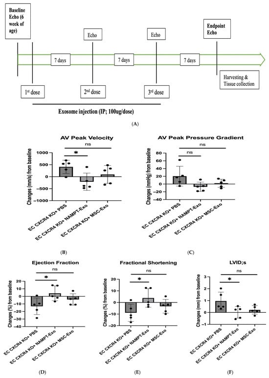EC CXCR4 KO (AS) mice were assessed by echocardiography for the development of aortic stenosis (AS) at 6 weeks of age, and mice that developed AS were randomly divided into three groups using a computer-generated sequence. AS mice were treated with intraperitoneal (IP) injection of 100 µL PBS (control group) and 100 µg exosomes (~1.91 × 1011 particles; suspended in 100 µL PBS) derived from either NAMPT-overexpressed MSC (NAMPT-Exo group) or regular MSC (MSC-Exo group) for three doses once a week. Follow-up echocardiography was performed at 7-day intervals after the first dose to monitor functional progression. Seven days after the final (3rd) dose of injection, endpoint echocardiography was performed, and thereafter, mice were harvested for histological and other assessments (Figure 3A).