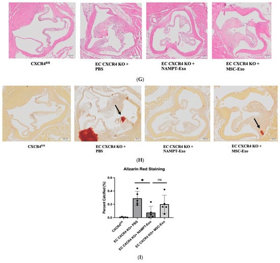 Next, to explore the role of NAMPT-Exo in aortic stenosis, we administered three doses of NAMPT-Exo to 6-week-old EC CXCR4 KO AS mice, along with PBS control and MSC-Exo, in different groups once a week (Figure 3A). The exosome dose was selected based on commonly reported exosome doses in mice from previously published studies [19,29]. Mice treated with NAMPT-Exo injection exhibited a significantly reduced aortic valve (AV) peak velocity and showed an improved trend in AV peak pressure gradient compared to the PBS control. (Figure 3B,C). Treatment also improved compromised cardiac function associated with aortic stenosis, including ejection fraction, fractional shortening, and LVID (Figure 3D–F). Consistent with these findings, histological assessment of aortic valve sections 7 days after the last dose of NAMPT-Exo injection (followed by endpoint echocardiography) also showed improvement. Reduced thickening (H&E staining) and calcification (Alizarin red staining) of stenotic valve leaflets were observed in the group treated with NAMPT-Exo injection (Figure 3G–I). These data suggested that NAMPT-Exo treatment halted the progression of aortic stenosis in EC CXCR4 KO mice.