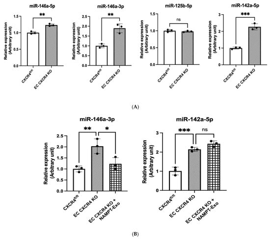 (A,B) qPCR analysis on the miRNAs’ expression in different groups. (A) Relative expression in the cardiac endothelial cell of CXCR4fl/fl vs. EC CXCR4 KO group. (B) Changes in relative expression after NAMPT-Exo treatment. n = 3; data are mean ± SD. One-way ANOVA followed by post hoc Tukey test; * p < 0.05, ** p < 0.01, and *** p <0.001. “ns” represents “not significant”. Each black dot represents an individual sample.