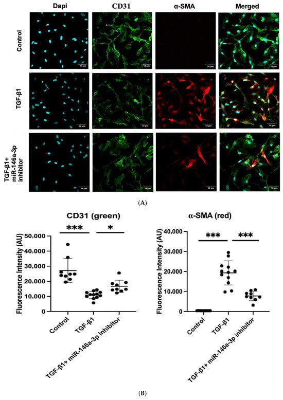Cardiac endothelial cells, either untreated or treated with TGF-β1 in the presence or absence of the miR-146a-3p inhibitor, were fixed in −20 °C methanol for 10 min. After fixing, they were blocked with 3% bovine serum albumin for 45 min at room temperature, followed by incubation with primary antibodies CD31 (Proteintech, Rosemont, IL, USA, 66065-2-Ig, 1:1000) and Alpha-SMA (Thermo Fisher Scientific, Waltham, MA, USA, PA5-85919, 1:200) overnight at 4 °C in the dark. The next day, after washing, the cells were incubated with corresponding fluorescent secondary antibodies, Coralite 488-conjugated goat anti-mouse IgG (Proteintech, Rosemont, IL, USA, SA00013-1, 1:200) and goat anti-rabbit IgG, Alexa FluorTM 594 (Thermo Fisher Scientific, Waltham, MA, USA, A11037, 1:250) at room temperature for 1 h. After washing, slides containing the immunolabeled cells were mounted with a mounting medium containing DAPI (Prolong Diamond Antifade Mountant with DAPI-Thermo Fisher Scientific, Waltham, MA, USA, P36971). Images were obtained using a confocal microscope, and all quantitative analyses were performed with ImageJ 1.53 software (NIH website) by investigators who were blinded to group allocation. All experiments were repeated at least two times, and representative results are shown.