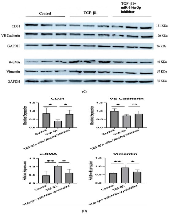 Since NAMPT-Exo treatment suppressed EndMT in aortic valves and also restored the expression of miR-146a-3p, we next evaluated whether miR-146a-3p directly influences EndMT progression. To investigate this, we used an in vitro model of TGF-β1-induced EndMT in endothelial cells [36,37]. We isolated cardiac endothelial cells from the EC CXCR4 KO mice and exposed them to TGF-β1 with or without the miR-146a-3p inhibitor. The miR-146a-3p inhibitor reduced TGF-β1-induced expression of the mesenchymal marker α-SMA in ECs, as shown by immunofluorescence staining (Figure 7A,B). Western blot analysis of endothelial markers CD31 and VE-cadherin, along with mesenchymal markers α-SMA and Vimentin, further confirmed that inhibiting miR-146a-3p decreased TGF-β1-mediated EndMT induction (Figure 7C,D).