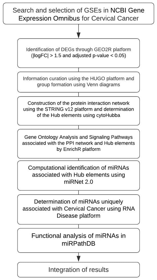 Gene expression datasets for cervical cancer were retrieved from the GEO database, and differentially expressed genes (DEGs) were identified by using GEO2R R 4.2.2, Biobase 2.58.0, GEOquery 2.66.0, limma 3.54.0 (|logFC| > 1.5, adjusted p < 0.05). Curated gene lists (based on HUGO nomenclature and Venn analysis) were used to construct a protein–protein interaction (PPI) network in STRING v12, with the hub genes determined through cytoHubba. Gene ontology (GO) and pathway enrichment analyses were performed using EnrichR. Hub gene–associated miRNAs were predicted with miRNet 2.0, disease-specific associations were retrieved from the RNA Disease database, and functional miRNA analyses were conducted in miRPathDB 2.0. The integrated analysis identified key genes, miRNAs, and pathways associated with cervical cancer (Figure 1).