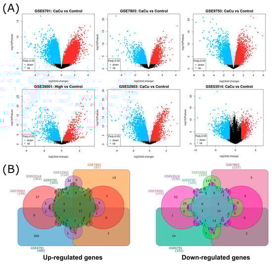 General distribution of DEGs by microarray. (A) Volcano plots from 6 microarray analyses, blue and red dots represented upregulated and downregulated genes, respectively. The black dots represent genes with basal expression. (B) Common upregulated and downregulated differentially expressed genes from cervical cancer visualized through a Venn diagram, (GSE39001 (106 up and 143 down DEGs), GSE52903 (122 up and 220 down DEGs), GSE63514 (363 up and 530 down DEGs), GSE6791 (480 up and 152 down DEGs), GSE7803 (97 up and 127 down DEGs), and GSE9750 (303 up and 320 down DEGs)). The numbers indicate the genes that are shared between microarrays.