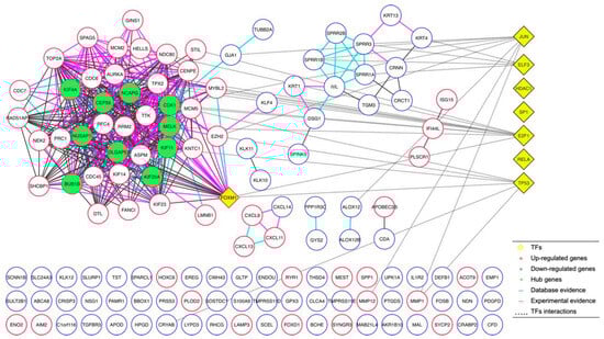 Once we determined the 134 DEGs shared between the microarrays and their expression trends, we continued our study by performing a protein–protein interaction analysis, generating an interaction network determining 10 DEGs (KIF4A, NUSAP1, BUB1B, CEP55, DLGAP5, NCAPG, CDK1, MELK, KIF11, and KIF20A) of the greatest importance (hub proteins), based on their evidence of interaction as well as the number of interactions they presented (Figure 5). Additionally, we observed that these 10 DEGs were characterized by being consistently overexpressed in their respective microarrays. Expression and interaction analysis identified the different genes associated with cervical cancer; therefore, their importance should be integrated. Interestingly, the proteins (hub) that participated in the protein–protein interaction network were not the first DEGs; however, they could be linked to TFs in GO analysis (Figure 5).