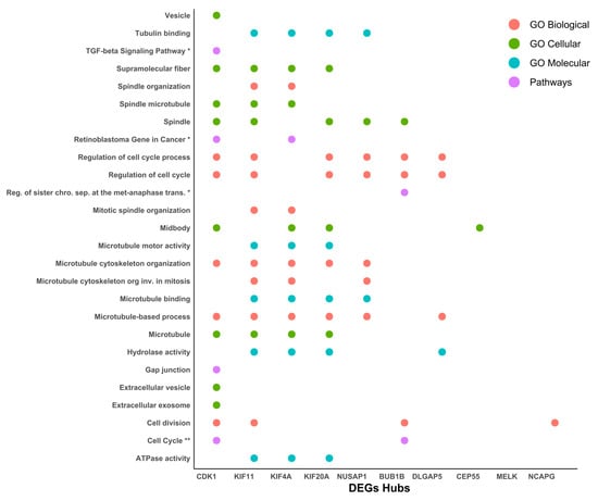 After the protein–protein interaction network was generated and we had obtained the 10 most relevant hub proteins in the network, we performed an ontology and signaling pathway analysis on these 10 elements, finding that CDK1 (cyclin-dependent kinase 1), Human kinesin family member 11 (KIF11), kinesin superfamily 4A (KIF4A), kinesin superfamily 20A (KIF20A), and Nucleolar and spindle-associated protein 1 (NUSAP1) were the five elements with the most significant participation in different processes related to the cytoskeleton, ATP synthesis, and cell-cycle regulation (Figure 6).