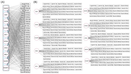 Interaction network between mRNAs of hub proteins and miRNAs. (A) miRNAs and mRNAs of hub protein interactions were determined using the online tool miRNet. (B) miRNAs and mRNAs of hub protein interactions were separated and amplified to clarify their association.