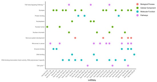 Nuclear organization is as dependent on protein binding as it can be on enzyme binding, DNA-binding transcription factor activity, RNA polymerase II-specificity, and DNA binding. This type of regulation could be linked to the TGF-beta signaling pathway and the cell cycle. Interestingly, in the synapse, microRNAs in cancer, and DNA-binding transcription factor activity, RNA polymerase II-specific processes were regulated by 12, 9, and 8 miRNAs, respectively, which were ranked as the most representative among all processes. DNA-binding transcription factor activity and RNA polymerase II-specific processes were linked to nuclear chromatin by miR-130a-3p, miR-203a-3p, miR-23b-3p, and miR-374a-5p, Figure 8. Further TGF-beta signaling pathway DNA-binding transcription factor activity, RNA polymerase II-specific, and nuclear chromatin processes were regulated by miR-130a-3p and miR-23b-3p. Interestingly, microRNAs in cancer were linked to nervous system development and enzyme binding by miR-34c-5p, miR-449a, and miR-449b-5p. In agreement, the activation of nervous-system-related genes in cervical cancer has been previously reported [77].